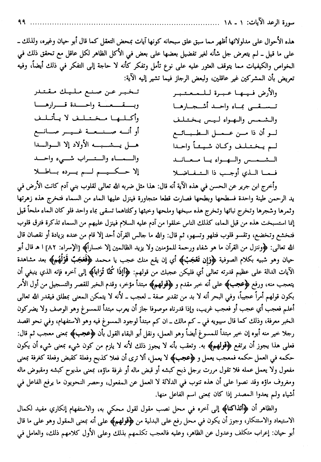 وأخرج ابن جرير عن الحسن في هذه الآية أنه قال: هذا مثل ضربه الله تعالى لقلوب بني آدم كانت الأرض في يد الرحمن طينة واحدة فسطحها وبطحها فصارت قطعا متجاورة فينزل عليها الماء من السماء فتخرج هذه زهرتها وثمرها وشجرها وتخرج نباتها وتخرج هذه سبخها وملحها وخبثها وكلتاهما تسقى بماء واحد فلو كان الماء ملحا قيل إنما استسبخت هذه من قبل الماء، كذلك الناس خلقوا من آدم عليه السلام فينزل عليهم من السماء تذكرة فترق قلوب فتخشع وتخضع، وتقسو قلوب فتلهو وتسهو، ثم قال: والله ما جالس القرآن أحد إلا قام من عنده بزيادة أو نقصان قال الله تعالى: وَنُنَزِّلُ مِنَ الْقُرْآنِ ما هُوَ شِفاءٌ وَرَحْمَةٌ لِلْمُؤْمِنِينَ وَلا يَزِيدُ الظَّالِمِينَ إِلَّا خَساراً [الإسراء: 82] اهـ قال أبو حيان وهو شبيه بكلام الصوفية وَإِنْ تَعْجَبْ أي إن يقع منك عجب يا محمد فَعَجَبٌ قَوْلُهُمْ بعد مشاهدة الآيات الدالة على عظيم قدرته تعالى أي فليكن عجبك من قولهم: أَإِذا كُنَّا تُراباً إلى آخره فإنه الذي ينبغي أن يتعجب منه، ورفع عجب على أنه خبر مقدم وقَوْلُهُمْ مبتدأ مؤخر، وقدم الخبر للقصر والتسجيل من أول الأمر بكون قولهم أمرا عجيبا، وفي البحر أنه لا بد من تقدير صفة- لعجب- لأنه لا يتمكن المعنى بمطلق فيقدر الله تعالى أعلم فعجب أي عجب أو فعجب غريب، وإذا قدرناه موصوفا جاز أن يعرب مبتدأ للمسوغ وهو الوصف ولا يضر كون الخبر معرفة، وذلك كما قال سيبويه في- كم مالك- ان كم مبتدأ لوجود المسوغ فيه وهو الاستفهام، وفي نحو اقصد رجلا خير منه أبوه إن خير مبتدأ للمسوغ أيضا وهو العمل، ونقل أبو البقاء القول بأن عجب بمعنى معجب ثم قال: