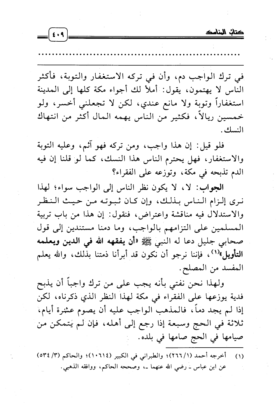في ترك الواجب دم، وأن في تركه الاستغفار والتوبة، فأكثر الناس لا يهتمون، يقول: أملأ لك أجواء مكة كلها إلى المدينة استغفاراً وتوبة ولا مانع عندي، لكن لا تجعلني أخسر، ولو خمسين ريالاً، فكثير من الناس يهمه المال أكثر من انتهاك النسك.