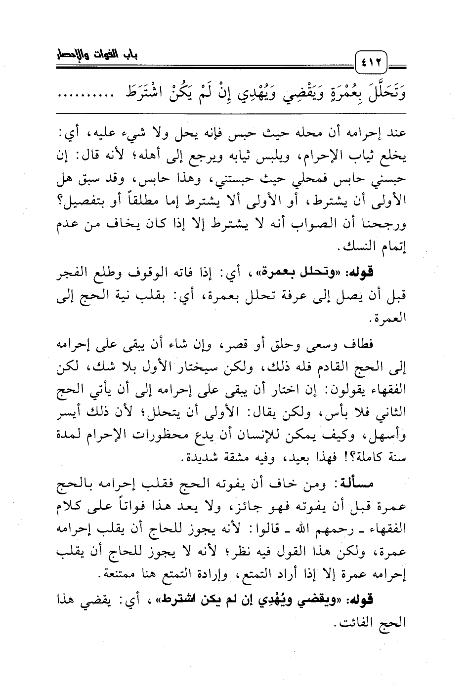 مسألة: ومن خاف أن يفوته الحج فقلب إحرامه بالحج عمرة قبل أن يفوته فهو جائز، ولا يعد هذا فواتاً على كلام الفقهاء ـ رحمهم الله ـ قالوا: لأنه يجوز للحاج أن يقلب إحرامه عمرة، ولكن هذا القول فيه نظر؛ لأنه لا يجوز للحاج أن يقلب إحرامه عمرة إلا إذا أراد التمتع، وإرادة التمتع هنا ممتنعة.