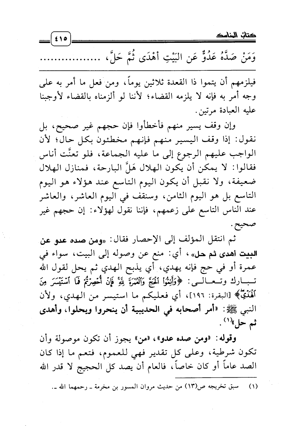 وقوله: «ومن صده عدو»، «من» يجوز أن تكون موصولة وأن تكون شرطية، وعلى كل تقدير فهي للعموم، فتعم ما إذا كان الصد عاماً أو كان خاصاً، فالعام أن يصد كل الحجيج لا قدر الله