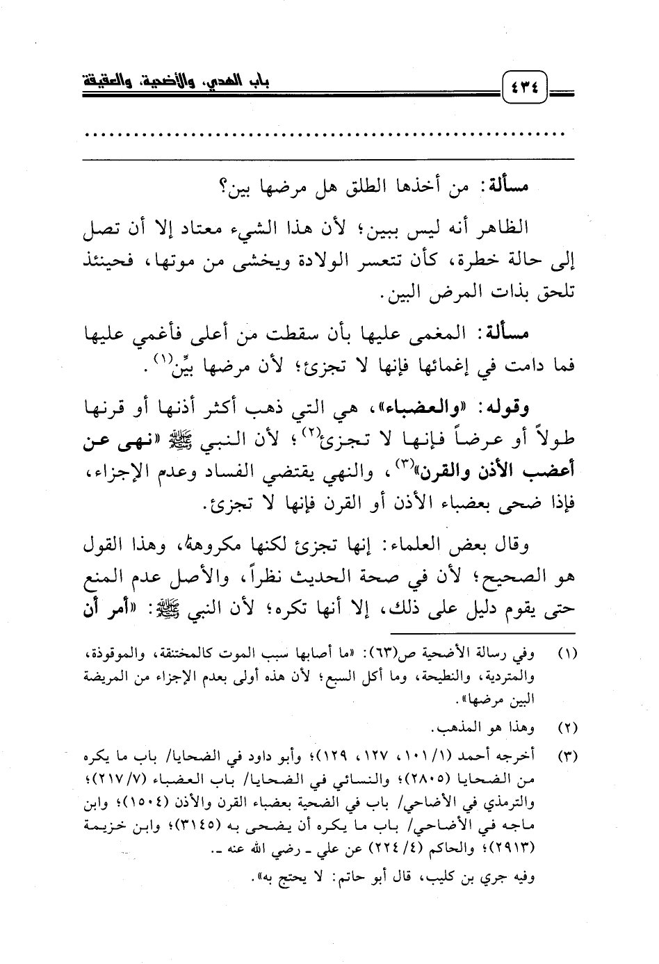 (¬3) أخرجه أحمد (1/ 101، 127، 129)؛ وأبو داود في الضحايا/ باب ما يكره من الضحايا (2805)؛ والنسائي في الضحايا/ باب العضباء (7/ 217)؛ والترمذي في الأضاحي/ باب في الضحية بعضباء القرن والأذن (1504)؛ وابن ماجه في الأضاحي/ باب ما يكره أن يضحى به (3145)؛ وابن خزيمة (2913)؛ والحاكم (4/ 224) عن علي ـ رضي الله عنه ـ.