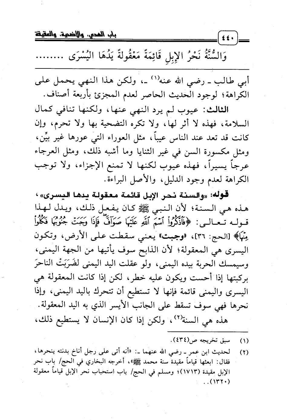 وَالسُّنَّةُ نَحْرُ الإِبِلِ قَائِمَةً مَعْقُولةً يَدُهَا اليُسْرَى فَيَطعَنُهَا بِالحَرْبَةِ فِي الوَهْدَةِ التَّي بَيْنَ أصْلِ العُنُقِ والصَّدْرِ، وَيَذْبَحَ غَيْرَهَا، وَيَجُوُز عكسُهَا