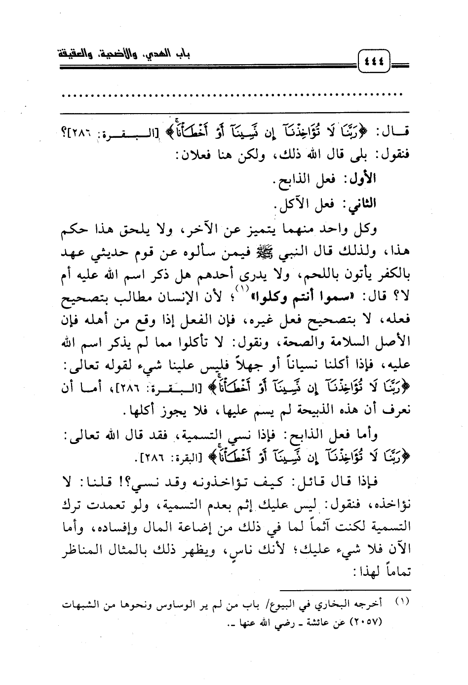 وكل واحد منهما يتميز عن الآخر، ولا يلحق هذا حكم هذا، ولذلك قال النبي صلّى الله عليه وسلّم فيمن سألوه عن قوم حديثي عهد بالكفر يأتون باللحم، ولا يدرى أحدهم هل ذكر اسم الله عليه أم لا؟ قال: «سموا أنتم وكلوا» (¬1)؛ لأن الإنسان مطالب بتصحيح فعله، لا بتصحيح فعل غيره، فإن الفعل إذا وقع من أهله فإن الأصل السلامة والصحة، ونقول: لا تأكلوا مما لم يذكر اسم الله عليه، فإذا أكلنا نسياناً أو جهلاً فليس علينا شيء لقوله تعالى: {رَبَّنَا لاَ تُؤَاخِذْنَا إِنْ نَسِيْنَا أَوْ أَخْطَأْنَا} [البقرة: 286]، أما أن نعرف أن هذه الذبيحة لم يسم عليها، فلا يجوز أكلها.