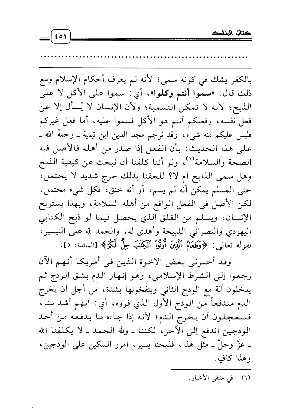 بالكفر يشك في كونه سمى؛ لأنه لم يعرف أحكام الإسلام ومع ذلك قال: «سموا أنتم وكلوا»، أي: سموا على الأكل لا على الذبح؛ لأنه لا تمكن التسمية؛ ولأن الإنسان لا يُسأل إلا عن فعل نفسه، وفعلكم أنتم هو الأكل فسموا عليه، أما فعل غيركم فليس عليكم منه شيء، وقد ترجم مجد الدين ابن تيمية ـ رحمه الله ـ على هذا الحديث: بأن الفعل إذا صدر من أهله فالأصل فيه الصحة والسلامة (¬1)، ولو أننا كلفنا أن نبحث عن كيفية الذبح وهل سمى الذابح أم لا؟ للحقنا بذلك حرج شديد لا يحتمل، حتى المسلم يمكن أنه لم يسم، أو أنه خنق، فكل شيء محتمل، لكن الأصل في الفعل الواقع من أهله السلامة، وبهذا يستريح الإنسان، ويسلم من القلق الذي يحصل فيما لو ذبح الكتابي اليهودي والنصراني الذبيحة وأهدى له، والحمد لله على التيسير، لقوله تعالى: {وَطَعَامُ الَّذِينَ أُوتُوا الْكِتَابَ حِلٌّ لَكُمْ} [المائدة: 5].