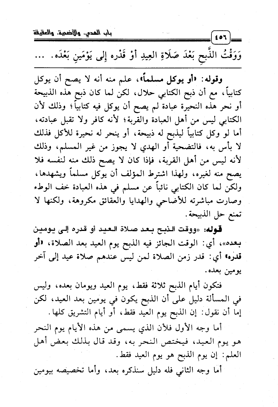 وقوله: «أو يوكل مسلماً»، علم منه أنه لا يصح أن يوكل كتابياً، مع أن ذبح الكتابي حلال، لكن لما كان ذبح هذه الذبيحة أو نحر هذه النحيرة عبادة لم يصح أن يوكل فيه كتابياً؛ وذلك لأن الكتابي ليس من أهل العبادة والقربة؛ لأنه كافر ولا تقبل عبادته، أما لو وكل كتابياً ليذبح له ذبيحة، أو ينحر له نحيرة للأكل فذلك لا بأس به، فالتضحية أو الهدي لا يجوز من غير المسلم، وذلك لأنه ليس من أهل القربة، فإذا كان لا يصح ذلك منه لنفسه فلا يصح منه لغيره، ولهذا اشترط المؤلف أن يوكل مسلماً ويشهدها، ولكن لما كان الكتابي نائباً عن مسلم في هذه العبادة خف الوطء وصارت مباشرته للأضاحي والهدايا والعقائق مكروهة، ولكنها لا تمنع حل الذبيحة.