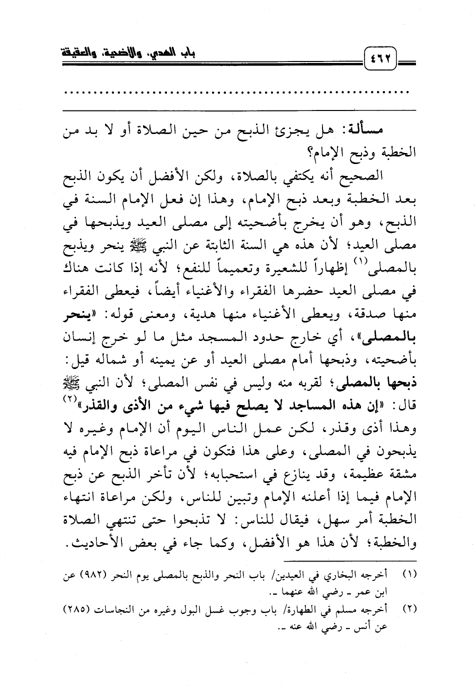 (¬1) أخرجه البخاري في العيدين/ باب النحر والذبح بالمصلى يوم النحر (982) عن ابن عمر ـ رضي الله عنهما ـ.