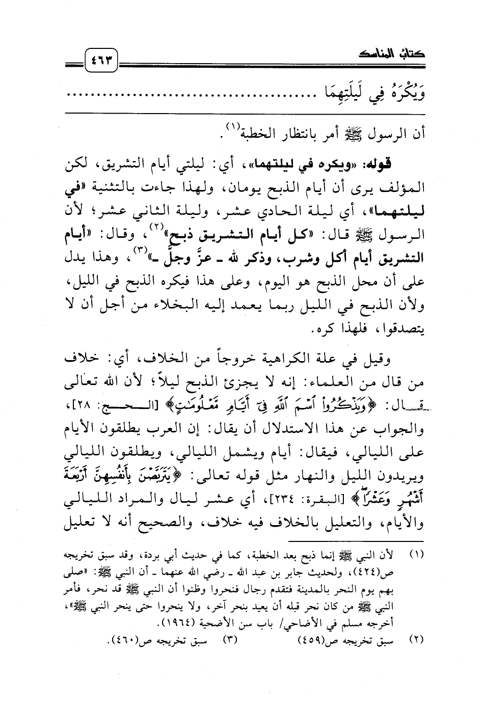 وقيل في علة الكراهية خروجاً من الخلاف، أي: خلاف من قال من العلماء: إنه لا يجزئ الذبح ليلاً؛ لأن الله تعالى قال: {وَيَذْكُرُوا اسْمَ اللَّهِ فِي أَيَّامٍ مَعْلُومَاتٍ} [الحج: 28]، والجواب عن هذا الاستدلال أن يقال: إن العرب يطلقون الأيام على الليالي، فيقال: أيام ويشمل الليالي، ويطلقون الليالي ويريدون الليل والنهار مثل قوله تعالى: {يَتَرَبَّصْنَ بِأَنْفُسِهِنَّ أَرْبَعَةَ أَشْهُرٍ وَعَشْرًا} [البقرة: 234]، أي عشر ليال والمراد الليالي والأيام، والتعليل بالخلاف فيه خلاف، والصحيح أنه لا تعليل