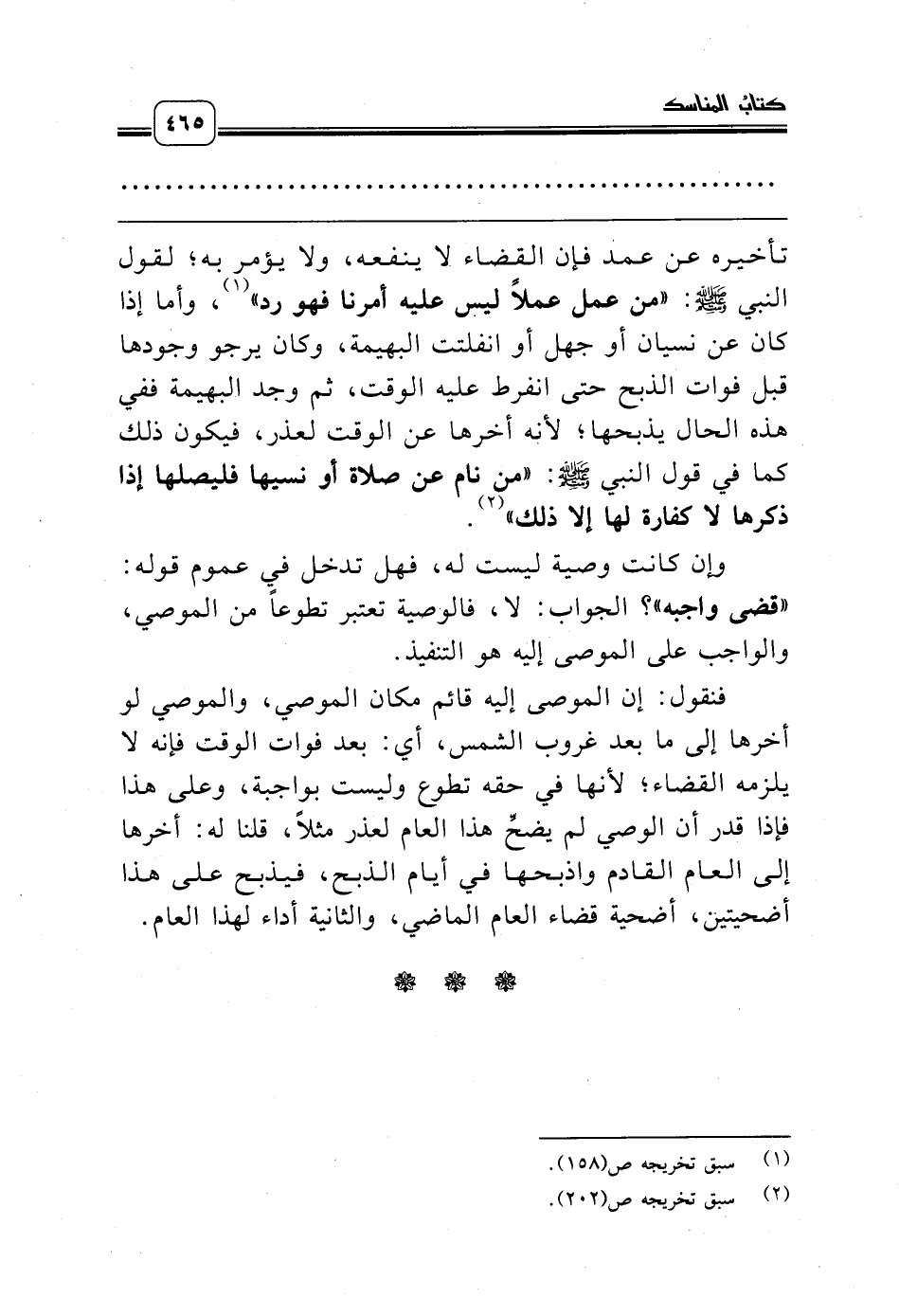 تأخيره عن عمد فإن القضاء لا ينفعه، ولا يؤمر به؛ لقول النبي صلّى الله عليه وسلّم: «من عمل عملاً ليس عليه أمرنا فهو رد» (¬1)، وأما إذا كان عن نسيان أو جهل أو انفلتت البهيمة، وكان يرجو وجودها قبل فوات الذبح حتى انفرط عليه الوقت، ثم وجد البهيمة ففي هذه الحال يذبحها؛ لأنه أخرها عن الوقت لعذر، فيكون ذلك كما في قول النبي صلّى الله عليه وسلّم: «من نام عن صلاة أو نسيها فليصلها إذا ذكرها لا كفارة لها إلا ذلك» (¬2).