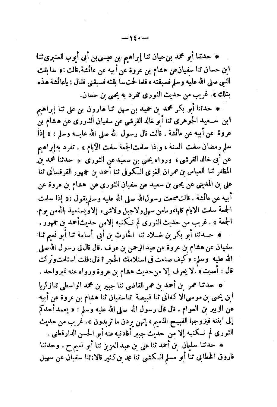 حَدَّثَنَا أَبُو بَكْرٍ مُحَمَّدُ بْنُ حُمَيْدِ بْنِ سَهْلٍ , ثنا هَارُونُ بْنُ عَلِيٍّ، ثنا إِبْرَاهِيمُ بْنُ سَعِيدٍ الْجَوْهَرِيُّ، ثنا أَبُو خَالِدٍ الْقُرَشِيُّ، عَنْ سُفْيَانَ الثَّوْرِيِّ، عَنْ هِشَامِ بْنِ عُرْوَةَ، عَنْ أَبِيهِ، عَنْ عَائِشَةَ، قَالَتْ: قَالَ رَسُولُ اللهِ صَلَّى اللهُ عَلَيْهِ وَسَلَّمَ: «§إِذَا سَلِمَ رَمَضَانُ سَلِمَتِ السَّنَةُ , وَإِذَا سَلِمَتِ الْجُمُعَةُ سَلِمَتِ الْأَيَّامُ» تَفَرَّدَ بِهِ إِبْرَاهِيمُ عَنْ أَبِي خَالِدٍ الْقُرَشِيِّ، وَرَوَاهُ، يَحْيَى بْنُ سَعِيدٍ عَنِ الثَّوْرِيِّ