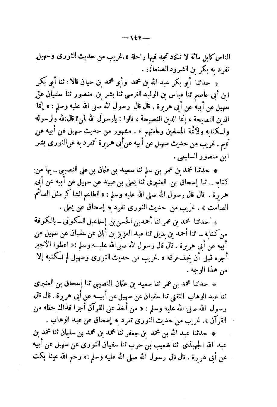 حَدَّثَنَا أَبُو بَكْرٍ عَبْدُ اللهِ بْنُ مُحَمَّدٍ، وَأَبُو مُحَمَّدِ بْنُ حَيَّانَ، قَالَا: ثنا أَبُو بَكْرِ بْنُ أَبِي عَاصِمٍ، ثنا عَبَّاسُ بْنُ الْوَلِيدِ النَّرْسِيُّ، ثنا بِشْرُ بْنُ مَنْصُورٍ، ثنا سُفْيَانُ، عَنْ سُهَيْلٍ، عَنْ أَبِيهِ، عَنْ أَبِي هُرَيْرَةَ، قَالَ: قَالَ رَسُولُ اللهِ صَلَّى اللهُ عَلَيْهِ وَسَلَّمَ: «إِنَّمَا §الدِّينُ النَّصِيحَةُ , إِنَّمَا الدِّينُ النَّصِيحَةُ» , قَالُوا: يَا رَسُولَ اللهِ , لِمَنْ؟ قَالَ: «لِلَّهِ، وَلِرَسُولِهِ، وَلِكِتَابِهِ، وَلِأَئِمَّةِ الْمُسْلِمِينَ، وَعَامَّتِهِمْ» مَشْهُورٌ مِنْ حَدِيثِ سُهَيْلٍ , عَنْ أَبِيهِ، عَنْ تَمِيمٍ. غَرِيبٌ مِنْ حَدِيثِ سُهَيْلٍ , عَنْ أَبِيهِ، عَنْ أَبِي هُرَيْرَةَ. تَفَرَّدَ بِهِ عَنِ الثَّوْرِيِّ، بِشْرُ بْنُ مَنْصُورٍ السَّلِيمِيُّ