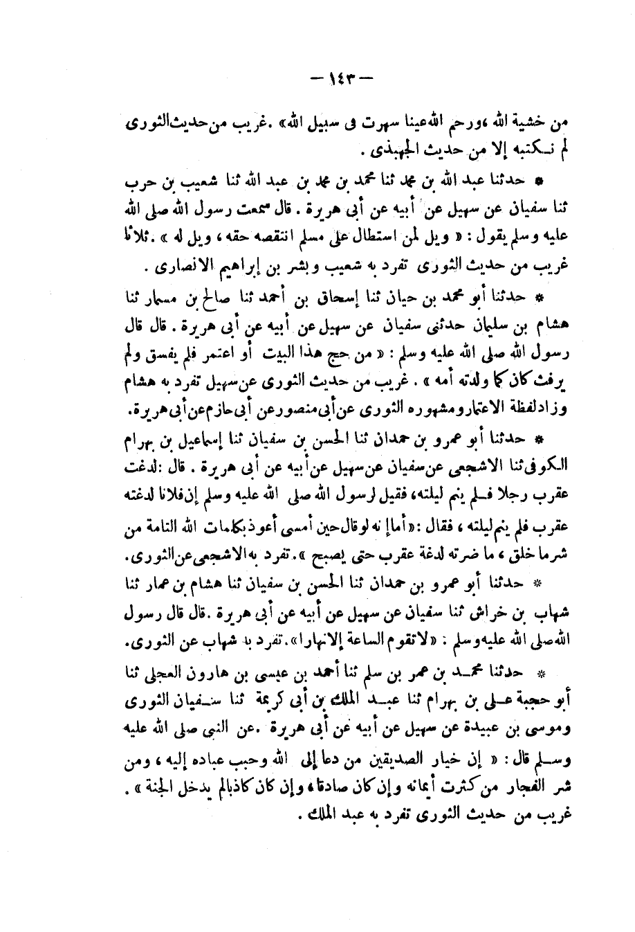 حَدَّثَنَا أَبُو عَمْرِو بْنُ حَمْدَانَ، ثنا الْحَسَنُ بْنُ سُفْيَانَ، ثنا هِشَامُ بْنُ عَمَّارٍ، ثنا شِهَابُ بْنُ خِرَاشٍ، ثنا سُفْيَانُ، عَنْ سُهَيْلٍ، عَنْ أَبِيهِ، عَنْ أَبِي هُرَيْرَةَ، قَالَ: قَالَ رَسُولُ اللهِ صَلَّى اللهُ عَلَيْهِ وَسَلَّمَ: «§لَا تَقُومُ السَّاعَةُ إِلَّا نَهَارًا» تَفَرَّدَ بِهِ شِهَابٌ , عَنِ الثَّوْرِيِّ