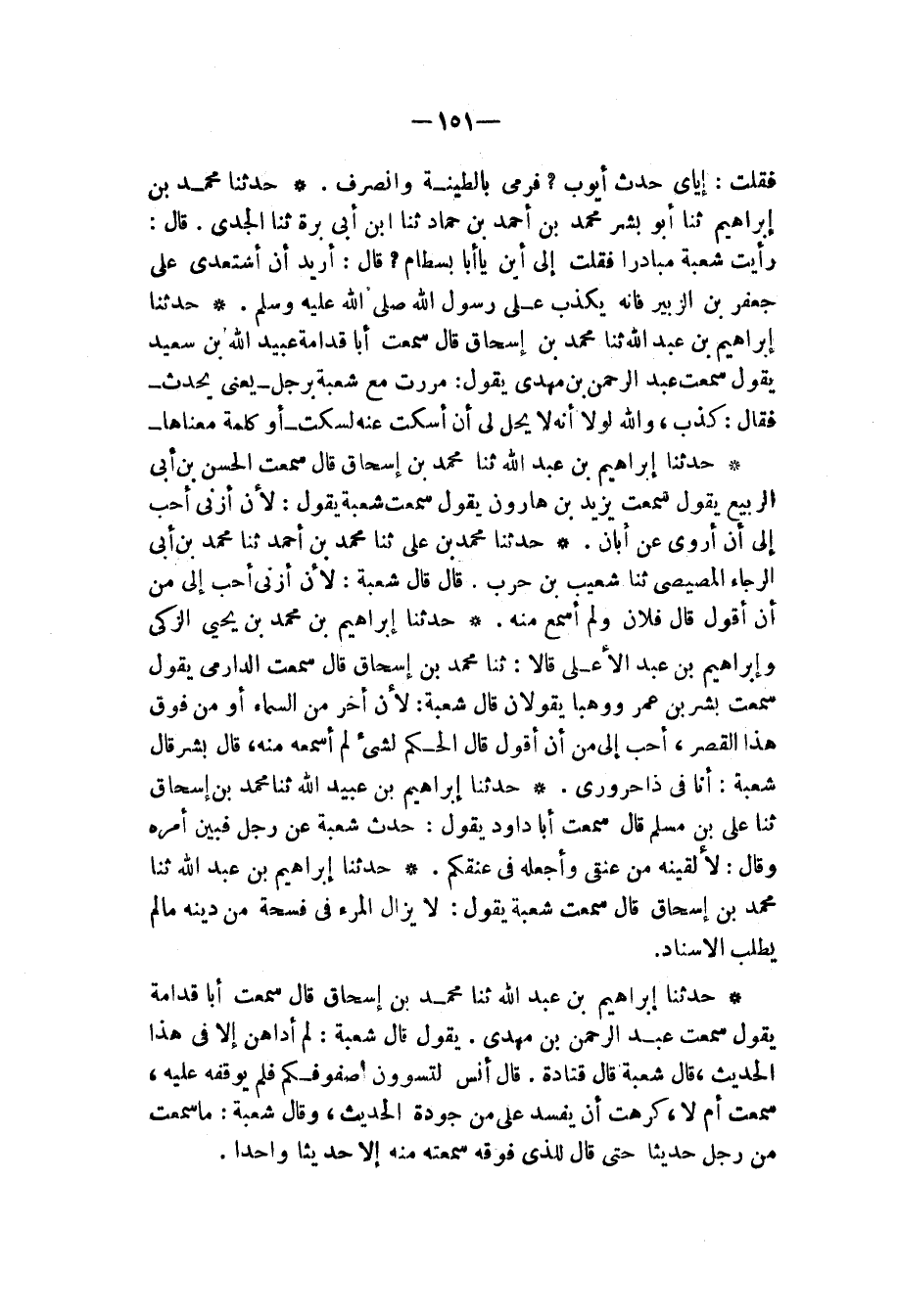 حَدَّثَنَا إِبْرَاهِيمُ بْنُ عَبْدِ اللهِ، ثنا مُحَمَّدُ بْنُ إِسْحَاقَ، قَالَ: سَمِعْتُ شُعْبَةَ، يَقُولُ: «§لَا يَزَالُ الْمَرْءُ فِي فُسْحَةٍ مِنْ دِينِهِ، مَا لَمْ يَطْلُبِ الْإِسْنَادَ»