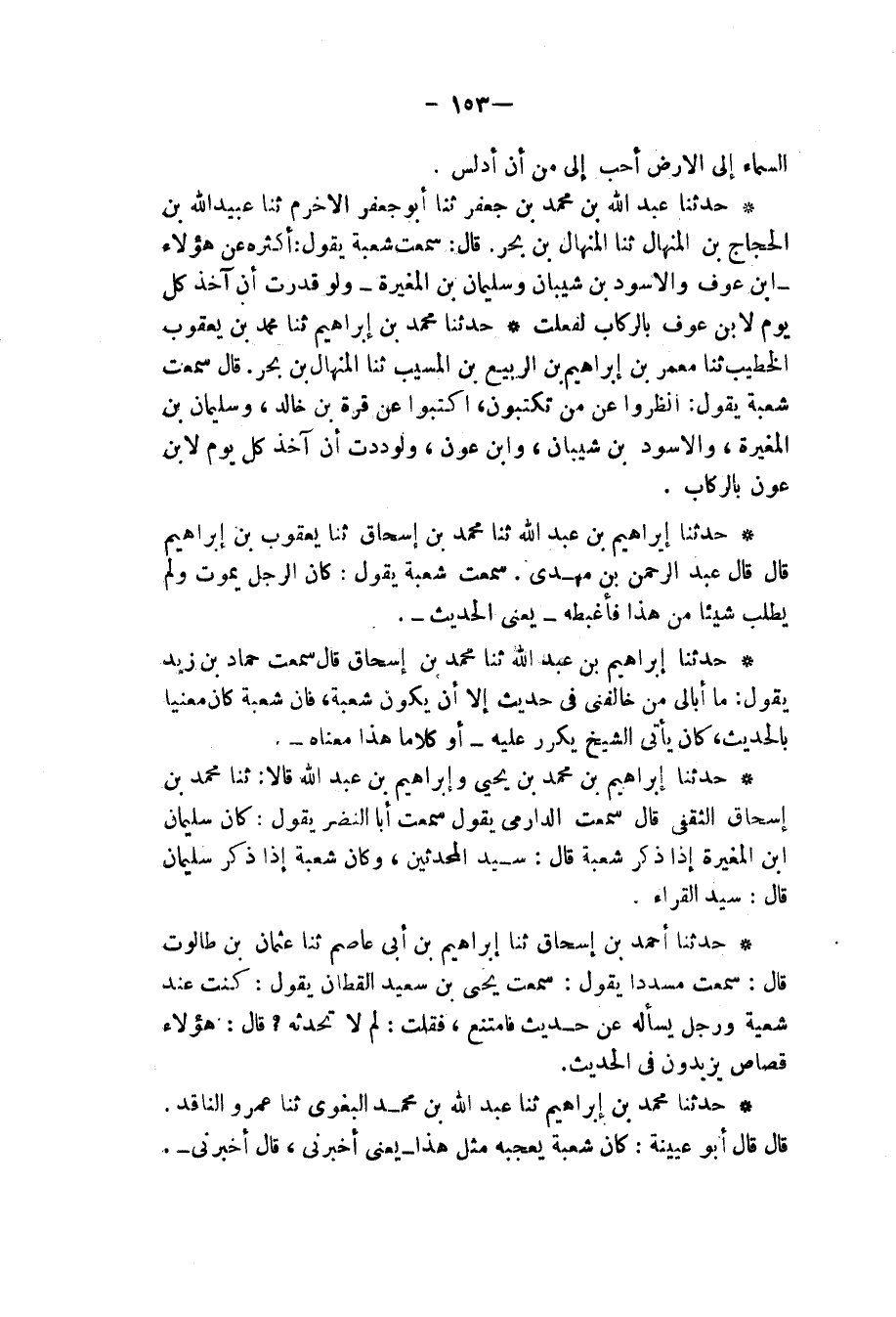 حَدَّثَنَا إِبْرَاهِيمُ بْنُ عَبْدِ اللهِ، ثنا مُحَمَّدُ بْنُ إِسْحَاقَ، ثنا يَعْقُوبُ بْنُ إِبْرَاهِيمَ، قَالَ: قَالَ عَبْدُ الرَّحْمَنِ بْنُ مَهْدِيٍّ: سَمِعْتُ شُعْبَةَ، يَقُولُ: «كَانَ §الرَّجُلُ يَمُوتُ وَلَمْ يَطْلُبْ شَيْئًا مِنْ هَذَا فَأَغْبِطُهُ - يَعْنِي الْحَدِيثَ»