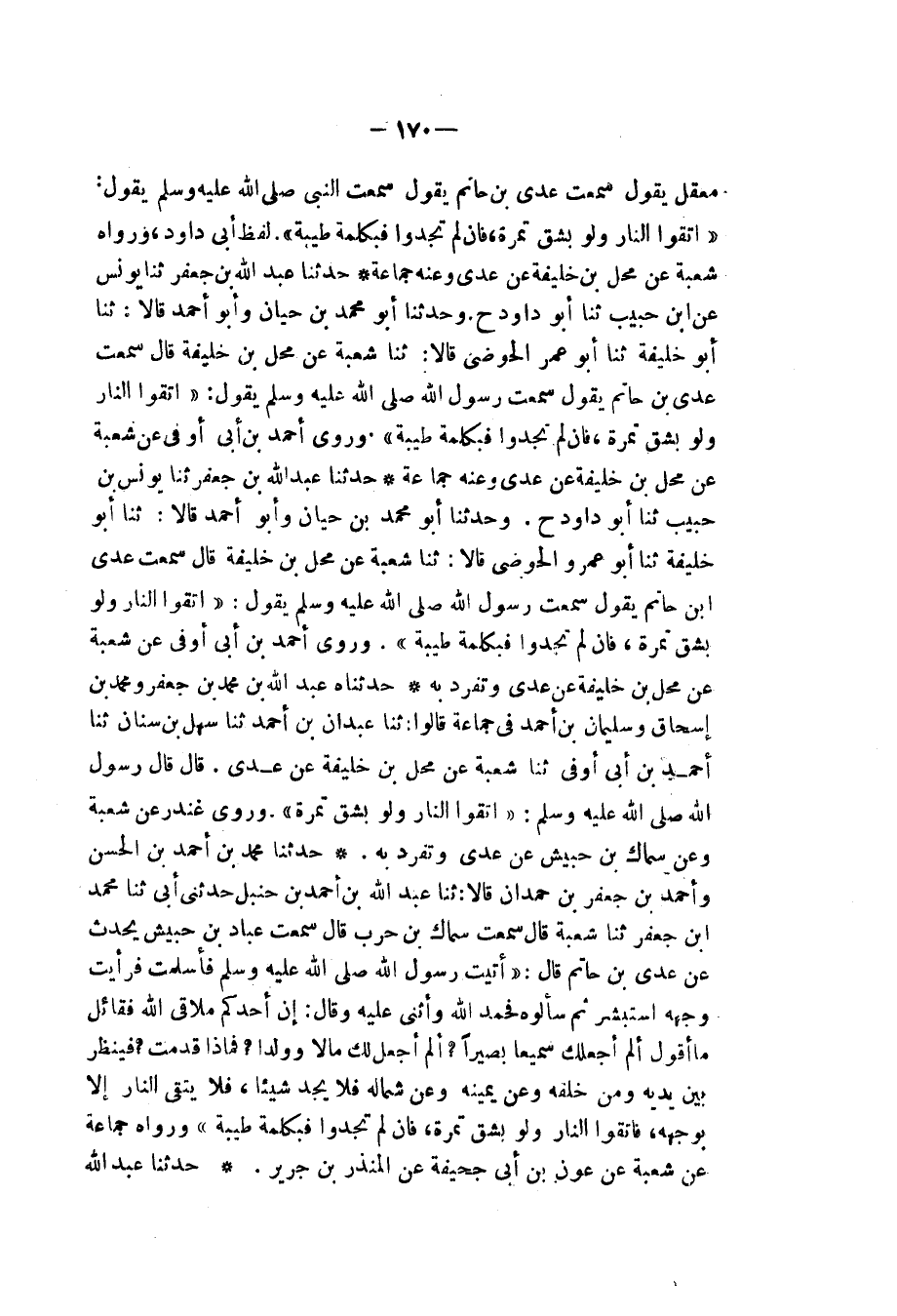 حَدَّثَنَا عَبْدُ اللهِ بْنُ مُحَمَّدِ بْنِ جَعْفَرٍ، وَمُحَمَّدُ بْنُ إِسْحَاقَ، وَسُلَيْمَانُ بْنُ أَحْمَدَ، فِي جَمَاعَةٍ قَالُوا: ثنا عَبْدَانُ بْنُ أَحْمَدَ، ثنا سَهْلُ بْنُ سِنَانٍ، ثنا أَحْمَدُ بْنُ أَبِي أَوْفَى، ثنا شُعْبَةُ، عَنْ مُحِلِّ بْنِ خَلِيفَةَ، عَنْ عَدِيٍّ، قَالَ: قَالَ رَسُولُ اللهِ صَلَّى اللهُ عَلَيْهِ وَسَلَّمَ. «§اتَّقُوا النَّارَ وَلَوْ بِشِقِّ تَمْرَةٍ» وَرَوَى غُنْدَرٌ، عَنْ شُعْبَةَ، وَعَنْ سِمَاكِ بْنِ حُبَيْشٍ، عَنْ عَدِيٍّ، وَتَفَرَّدَ بِهِ