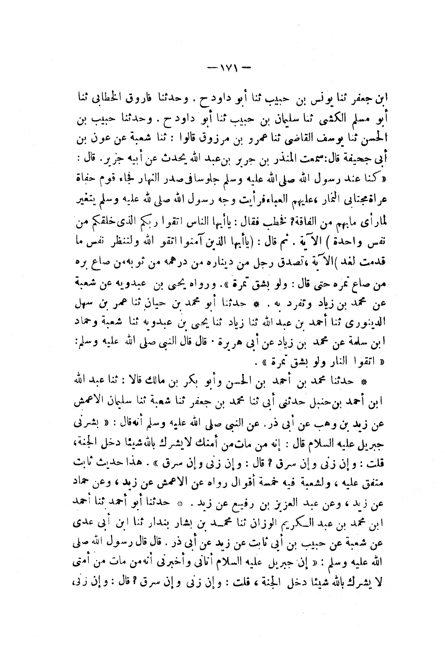 حَدَّثَنَا مُحَمَّدُ بْنُ أَحْمَدَ بْنِ الْحَسَنِ، وَأَبُو بَكْرِ بْنُ مَالِكٍ، قَالَا: ثنا عَبْدُ اللهِ بْنُ أَحْمَدَ بْنِ حَنْبَلٍ، حَدَّثَنِي أَبِي، ثنا مُحَمَّدُ بْنُ جَعْفَرٍ، ثنا شُعْبَةُ، ثنا سُلَيْمَانُ الْأَعْمَشُ، عَنْ زَيْدِ بْنِ وَهْبٍ، عَنْ أَبِي ذَرٍّ، عَنِ النَّبِيِّ صَلَّى اللهُ عَلَيْهِ وَسَلَّمَ أَنَّهُ قَالَ: " §بَشَّرَنِي جِبْرِيلُ عَلَيْهِ السَّلَامُ قَالَ: إِنَّهُ مَنْ مَاتَ مِنْ أُمَّتِكَ لَا يُشْرِكُ بِاللهِ شَيْئًا دَخَلَ الْجَنَّةَ " , قُلْتُ: وَإِنْ زَنَى وَإِنْ سَرَقَ؟ قَالَ: «وَإِنْ زَنَى وَإِنْ سَرَقَ» هَذَا حَدِيثٌ ثَابِتٌ مُتَّفَقٌ عَلَيْهِ , وَلِشُعْبَةَ فِيهِ خَمْسَةُ أَقْوَالٍ: رَوَاهُ عَنِ الْأَعْمَشِ , عَنْ زَيْدٍ، وَعَنْ حَمَّادٍ , عَنْ زَيْدٍ، وَعَنْ عَبْدِ الْعَزِيزِ بْنِ رُفَيْعٍ، عَنْ زَيْدٍ