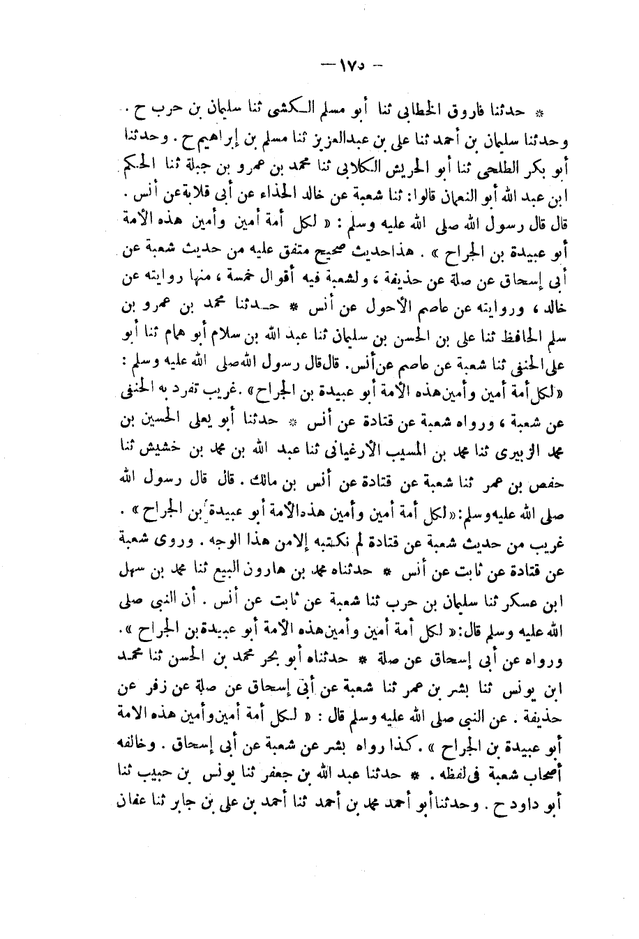 حَدَّثَنَا فَارُوقٌ الْخَطَّابِيُّ، ثنا أَبُو مُسْلِمٍ الْكَشِّيُّ، ثنا سُلَيْمَانُ بْنُ حَرْبٍ، ح وَحَدَّثَنَا سُلَيْمَانُ بْنُ أَحْمَدَ، ثنا عَلِيُّ بْنُ عَبْدِ الْعَزِيزِ، ثنا مُسْلِمُ بْنُ إِبْرَاهِيمَ، ح وَحَدَّثَنَا أَبُو بَكْرٍ الطَّلْحِيُّ، ثنا أَبُو الْحَرِيشِ الْكِلَابِيُّ، ثنا مُحَمَّدُ بْنُ عَمْرِو بْنِ جَبَلَةَ، ثنا الْحَكَمُ بْنُ عَبْدِ اللهِ أَبُو النُّعْمَانِ، قَالُوا: ثنا شُعْبَةُ، عَنْ خَالِدٍ الْحَذَّاءِ، عَنْ أَبِي قِلَابَةَ، عَنْ أَنَسٍ، قَالَ: قَالَ رَسُولُ اللهِ صَلَّى اللهُ عَلَيْهِ وَسَلَّمَ: «§وَلِكُلِّ أُمَّةٍ أَمِينٌ , وَأَمِينُ هَذِهِ الْأُمَّةِ أَبُو عُبَيْدَةَ بْنُ الْجَرَّاحِ» هَذَا حَدِيثٌ صَحِيحٌ مُتَّفَقٌ عَلَيْهِ مِنْ حَدِيثِ شُعْبَةَ عَنْ أَبِي إِسْحَاقَ , عَنْ صِلَةَ , عَنْ حُذَيْفَةَ , وَلِشُعْبَةَ فِيهِ أَقْوَالٌ خَمْسَةٌ