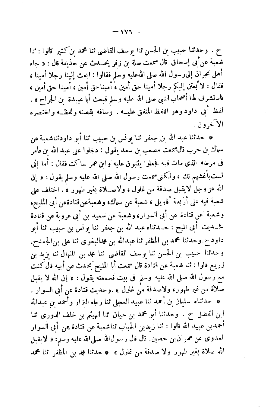 حَدَّثَنَا مُحَمَّدُ بْنُ الْمُظَفَّرِ، ثنا مُحَمَّدُ -[177]- بْنُ مُحَمَّدٍ بَانِيقَا بْنِ يَاسِينَ، ثنا مُحَمَّدُ بْنُ عَبْدِ اللهِ الْجِهْبِذُ، ثنا شَبَابَةُ، ثنا شُعْبَةُ، عَنْ سَعِيدِ بْنِ أَبِي عَرُوبَةَ، عَنْ قَتَادَةَ، عَنْ أَبِي الْمَلِيحِ بْنِ أُسَامَةَ، عَنْ أَبِيهِ، " عَنِ النَّبِيِّ صَلَّى اللهُ عَلَيْهِ وَسَلَّمَ قَالَ: «إِنَّ §اللهَ لَا يَقْبَلُ صَلَاةً بِغَيْرِ طَهُورٍ , وَلَا صَدَقَةً مِنْ غُلُولٍ»