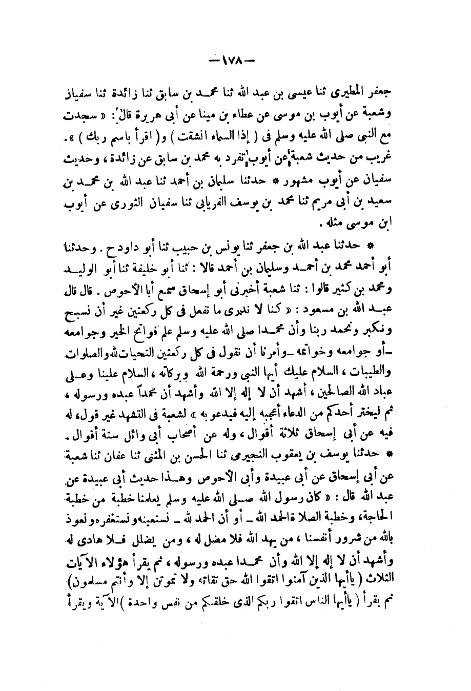 حَدَّثَنَا يُوسُفُ بْنُ يَعْقُوبَ النَّجِيرَمِيُّ، ثنا الْحَسَنُ بْنُ الْمُثَنَّى، ثنا عَفَّانُ، ثنا شُعْبَةُ، عَنْ أَبِي إِسْحَاقَ، عَنْ أَبِي عُبَيْدَةَ، وَأَبِي الْأَحْوَصِ، - وَهَذَا حَدِيثُ أَبِي عُبَيْدَةَ , عَنْ عَبْدِ اللهِ، قَالَ: " كَانَ §رَسُولُ اللهِ صَلَّى اللهُ عَلَيْهِ وَسَلَّمَ يُعَلِّمُنَا خُطْبَةً مِنْ خُطْبَةِ الْحَاجَةِ , وَخُطْبَةَ الصَّلَاةِ: «الْحَمْدُ لِلَّهِ - أَوْ إِنَّ الْحَمْدَ لِلَّهِ - نَسْتَعِينُهُ وَنَسْتَغْفِرُهُ , وَنَعُوذُ بِاللهِ مِنْ شُرُورِ أَنْفُسِنَا , مَنْ يَهْدِ اللهُ فَلَا مُضِلَّ لَهُ , وَمَنْ يُضْلِلْ فَلَا هَادِيَ لَهُ , وَأَشْهَدُ أَنْ لَا إِلَهَ إِلَّا اللهُ , وَأَنَّ مُحَمَّدًا عَبْدُهُ وَرَسُولُهُ» ثُمَّ يَقْرَأُ هَؤُلَاءِ الْآيَاتِ الثَّلَاثَ {يَا أَيُّهَا الَّذِينَ آمَنُوا اتَّقُوا اللهَ حَقَّ تُقَاتِهِ وَلَا تَمُوتُنَّ إِلَّا وَأَنْتُمْ مُسْلِمُونَ} [آل عمران: 102] ثُمَّ يَقْرَأُ {يَا أَيُّهَا النَّاسُ اتَّقُوا رَبُّكُمُ الَّذِي خَلَقَكُمْ مِنْ نَفْسٍ وَاحِدَةٍ} [النساء: 1] الْآيَةَ , وَيَقْرَأُ -[179]- {يَا أَيُّهَا الَّذِينَ آمَنُوا اتَّقُوا اللهَ وَقُولُوا قَوْلًا سَدِيدًا} [الأحزاب: 70] الْآيَةَ , ثُمَّ يَتَكَلَّمُ لِحَاجَتِهِ " كَذَا رَوَاهُ شُعْبَةُ , عَنْ أَبِي إِسْحَاقَ، عَنْ أَبِي عُبَيْدَةَ، تَفَرَّدَ بِهِ عَنْهُ عَفَّانُ , وَحَدِيثُ أَبِي إِسْحَاقَ , عَنْ أَبِي الْأَحْوَصِ مَشْهُورٌ , فَرِوَايَتُهُ عَنْ أَصْحَابِ أَبِي وَائِلٍ. رَوَى عَنْ سُلَيْمَانَ الْأَعْمَشِ، وَمَنْصُورِ بْنِ الْمُعْتَمِرِ , وَحَمَّادِ بْنِ أَبِي سُلَيْمَانَ , وَالْمُغِيرَةِ بْنِ مِقْسَمٍ , وَأَبِي هَاشِمٍ , وَالْحَكَمِ بْنِ عُتَيْبَةَ , وَحُصَيْنِ بْنِ عَبْدِ الرَّحْمَنِ , وَتَفَرَّدَ مُحَمَّدُ بْنُ مُنَازِلٍ , عَنْ شُعْبَةَ، عَنْ أَبِي إِسْحَاقَ، عَنْ أَبِي الْكَنُودِ، عَنِ ابْنِ مَسْعُودٍ