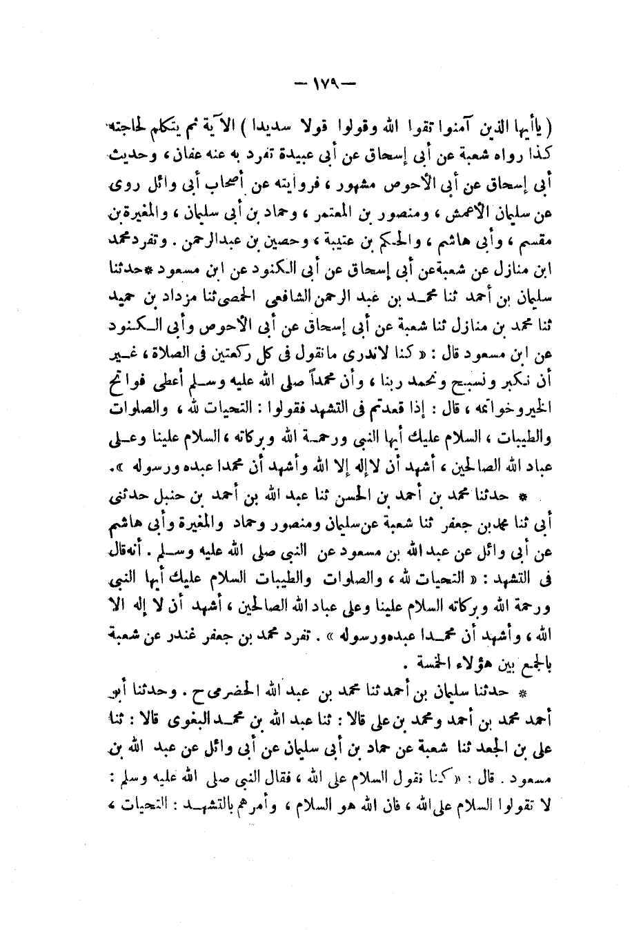 حَدَّثَنَا مُحَمَّدُ بْنُ أَحْمَدَ بْنِ الْحَسَنِ، ثنا عَبْدُ اللهِ بْنُ أَحْمَدَ بْنِ حَنْبَلٍ، حَدَّثَنِي أَبِي، ثنا مُحَمَّدُ بْنُ جَعْفَرٍ، ثنا شُعْبَةُ، عَنْ سُلَيْمَانَ، وَمَنْصُورٍ، وَحَمَّادٍ، وَالْمُغِيرَةِ، وَأَبِي هَاشِمٍ , عَنْ أَبِي وَائِلٍ، عَنْ عَبْدِ اللهِ بْنِ مَسْعُودٍ، عَنِ النَّبِيِّ صَلَّى اللهُ عَلَيْهِ وَسَلَّمَ أَنَّهُ قَالَ فِي التَّشَهُّدِ: «§التَّحِيَّاتُ لِلَّهِ , وَالصَّلَوَاتُ وَالطَّيِّبَاتُ , السَّلَامُ عَلَيْكَ أَيُّهَا النَّبِيُّ وَرَحْمَةُ اللهِ وَبَرَكَاتُهُ , السَّلَامُ عَلَيْنَا وَعَلَى عِبَادِ اللهِ الصَّالِحِينَ , أَشْهَدُ أَنْ لَا إِلَهَ إِلَّا اللهُ , وَأَشْهَدُ أَنَّ مُحَمَّدًا عَبْدُهُ وَرَسُولُهُ» تَفَرَّدَ بِهِ مُحَمَّدُ بْنُ جَعْفَرٍ غُنْدَرٌ , عَنْ شُعْبَةَ بِالْجَمْعِ بَيْنَ هَؤُلَاءِ الْخَمْسَةِ