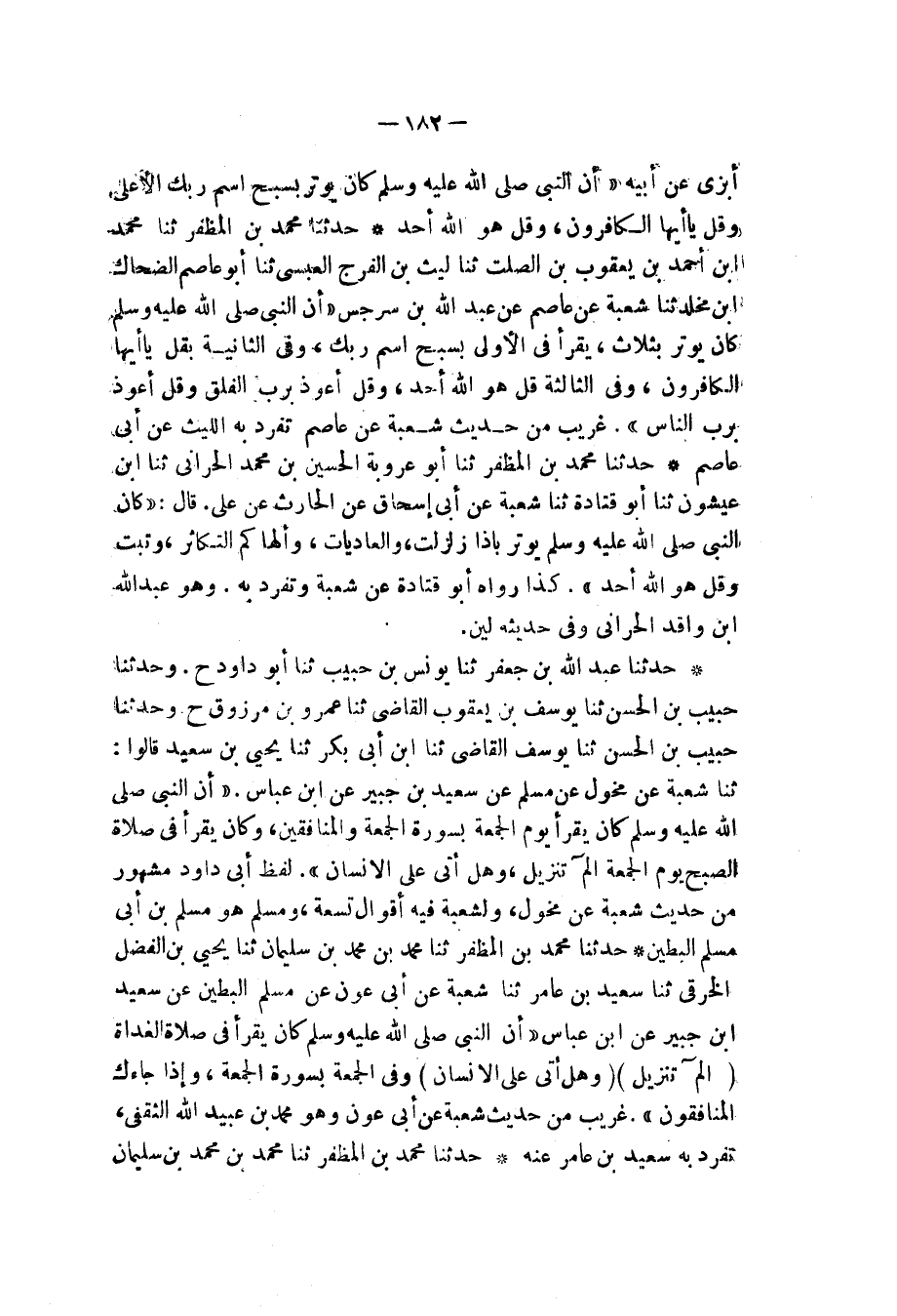 حَدَّثَنَا مُحَمَّدُ بْنُ الْمُظَفَّرِ، ثنا أَبُو عَرُوبَةَ الْحُسَيْنُ بْنُ مُحَمَّدٍ الْحَرَّانِيُّ، ثنا ابْنُ عَيْشُونٍ، ثنا أَبُو قَتَادَةَ، ثنا شُعْبَةُ، عَنْ أَبِي إِسْحَاقَ، عَنِ الْحَارِثِ، عَنْ عَلِيٍّ، قَالَ: «§كَانَ النَّبِيُّ صَلَّى اللهُ عَلَيْهِ وَسَلَّمَ يُوتِرُ بِ إِذَا زُلْزِلَتْ، وَالْعَادِيَاتِ , وَأَلْهَاكُمُ التَّكَاثُرُ وَتَبَّتْ وَقُلْ هُوَ اللهُ أَحَدٌ» كَذَا رَوَاهُ أَبُو قَتَادَةَ , عَنْ شُعْبَةَ، وَتَفَرَّدَ بِهِ. وَهُوَ عَبْدُ اللهِ بْنُ وَاقِدٍ الْحَرَّانِيُّ , وَفِي حَدِيثِهِ لِينٌ