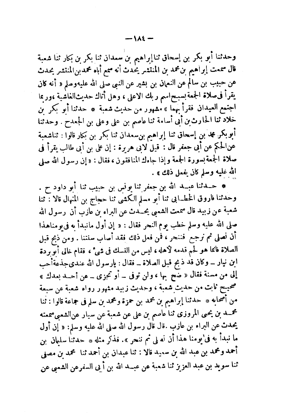 حَدَّثَنَا إِبْرَاهِيمُ بْنُ مُحَمَّدِ بْنِ حَمْزَةَ، وَمُحَمَّدُ بْنُ سَلْمٍ، فِي جَمَاعَةٍ قَالُوا: ثنا مُحَمَّدُ بْنُ يَحْيَى الْمَرْوَزِيُّ، ثنا عَاصِمُ بْنُ عَلِيٍّ، عَنْ شُعْبَةَ، عَنْ سَيَّارٍ، عَنِ الشَّعْبِيِّ، سَمِعْتُهُ يُحَدِّثُ، عَنِ الْبَرَاءِ بْنِ عَازِبٍ، قَالَ: " قَالَ رَسُولُ اللهِ صَلَّى اللهُ عَلَيْهِ وَسَلَّمَ: «إِنَّ §أَوَّلَ مَا نَبْدَأُ بِهِ فِي يَوْمِنَا هَذَا أَنْ نُصَلِّيَ ثُمَّ نَنْحَرَ» فَذَكَرَ مِثْلَهُ