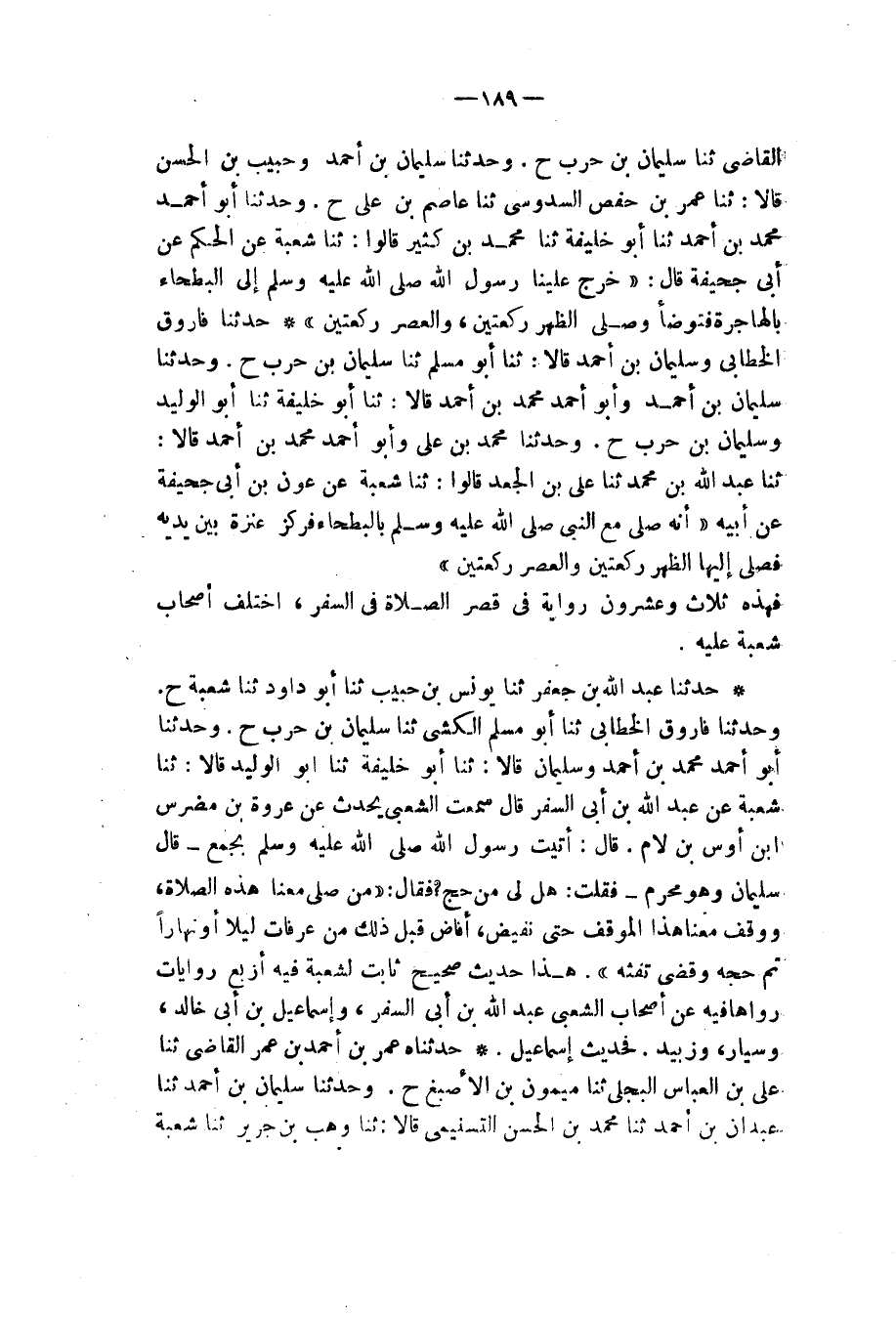 حَدَّثَنَا فَارُوقٌ الْخَطَّابِيُّ، وَسُلَيْمَانُ بْنُ أَحْمَدَ، قَالَا: ثنا أَبُو مُسْلِمٍ، ثنا سُلَيْمَانُ بْنُ حَرْبٍ، ح وَحَدَّثَنَا سُلَيْمَانُ بْنُ أَحْمَدَ، وَأَبُو أَحْمَدَ مُحَمَّدُ بْنُ أَحْمَدَ، قَالَا: ثنا أَبُو خَلِيفَةَ، ثنا أَبُو الْوَلِيدِ، وَسُلَيْمَانُ بْنُ حَرْبٍ، ح وَحَدَّثَنَا مُحَمَّدُ بْنُ عَلِيٍّ، وَأَبُو أَحْمَدَ مُحَمَّدُ بْنُ أَحْمَدَ، قَالَا: ثنا عَبْدُ اللهِ بْنُ مُحَمَّدٍ، ثنا عَلِيُّ بْنُ الْجَعْدِ، قَالُوا: ثنا شُعْبَةُ، عَنْ عَوْنِ بْنِ أَبِي جُحَيْفَةَ، عَنْ أَبِيهِ، «أَنَّهُ §صَلَّى مَعَ النَّبِيِّ صَلَّى اللهُ عَلَيْهِ وَسَلَّمَ بِالْبَطْحَاءِ , فَرَكَزَ عَنَزَةً بَيْنَ يَدَيْهِ , فَصَلَّى إِلَيْهَا الظُّهْرَ رَكْعَتَيْنِ , وَالْعَصْرَ رَكْعَتَيْنِ» فَهَذِهِ ثَلَاثٌ وَعِشْرُونَ رِوَايَةً فِي قَصْرِ الصَّلَاةِ فِي السَّفَرِ , اخْتَلَفَ أَصْحَابُ شُعْبَةَ عَلَيْهِ