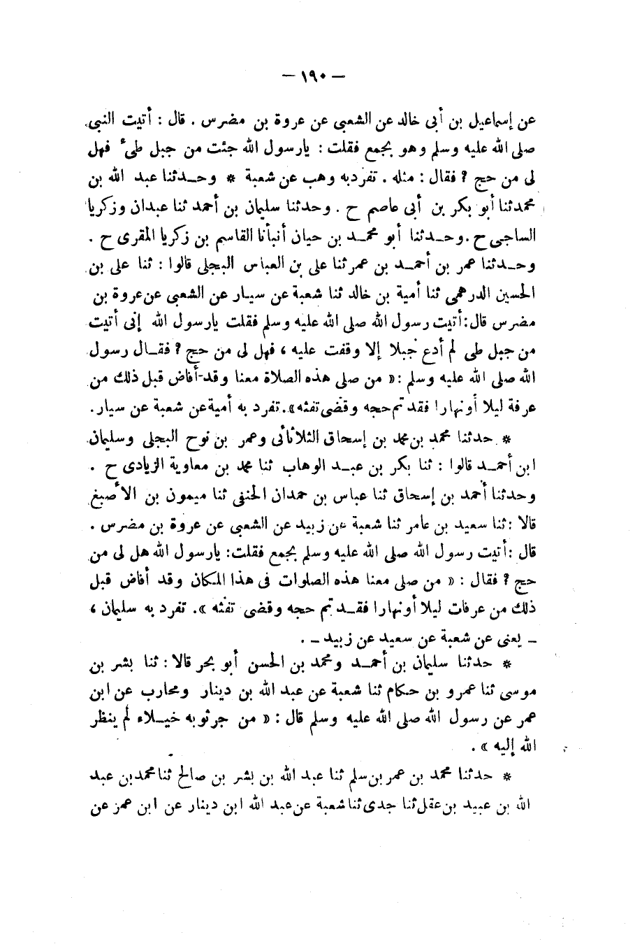 وَحَدَّثَنَا عَبْدُ اللهِ بْنُ مُحَمَّدٍ، ثنا أَبُو بَكْرِ بْنُ أَبِي عَاصِمٍ، ح وَحَدَّثَنَا سُلَيْمَانُ بْنُ أَحْمَدَ، ثنا عَبْدَانُ، وَزَكَرِيَّا السَّاجِيُّ، ح وَحَدَّثَنَا أَبُو مُحَمَّدِ بْنُ حَيَّانَ، أَنْبَأَنَا الْقَاسِمُ بْنُ زَكَرِيَّا الْمُقْرِئُ، ح وَحَدَّثَنَا عُمَرُ بْنُ أَحْمَدَ بْنِ عُمَرَ، ثنا عَلِيُّ بْنُ الْعَبَّاسِ الْبَجَلِيُّ، قَالُوا: ثنا عَلِيُّ بْنُ الْحُسَيْنِ الدِّرْهَمِيُّ، ثنا أُمَيَّةُ بْنُ خَالِدٍ، ثنا شُعْبَةُ، عَنْ سَيَّارٍ، عَنِ الشَّعْبِيِّ، عَنْ عُرْوَةَ بْنِ مُضَرِّسٍ، قَالَ: " أَتَيْتُ رَسُولَ اللهِ صَلَّى اللهُ عَلَيْهِ وَسَلَّمَ فَقُلْتُ: يَا رَسُولَ اللهِ , إِنِّي أَتَيْتُ مِنْ جَبَلِ طَيِّئٍ , لَمْ أَدَعْ جَبَلًا إِلَّا وَقَفْتُ عَلَيْهِ , فَهَلْ لِي مِنْ حَجٍّ؟ فَقَالَ رَسُولُ اللهِ صَلَّى اللهُ عَلَيْهِ وَسَلَّمَ: «§مَنْ صَلَّى هَذِهِ الصَّلَاةَ مَعَنَا , وَقَدْ أَفَاضَ قَبْلَ ذَلِكَ مِنْ عَرَفَةَ لَيْلًا أَوْ نَهَارًا , فَقَدْ تَمَّ حَجُّهُ , وَقَضَى تَفَثَهُ» تَفَرَّدَ بِهِ أُمَيَّةُ عَنْ شُعْبَةَ , عَنْ سَيَّارٍ
