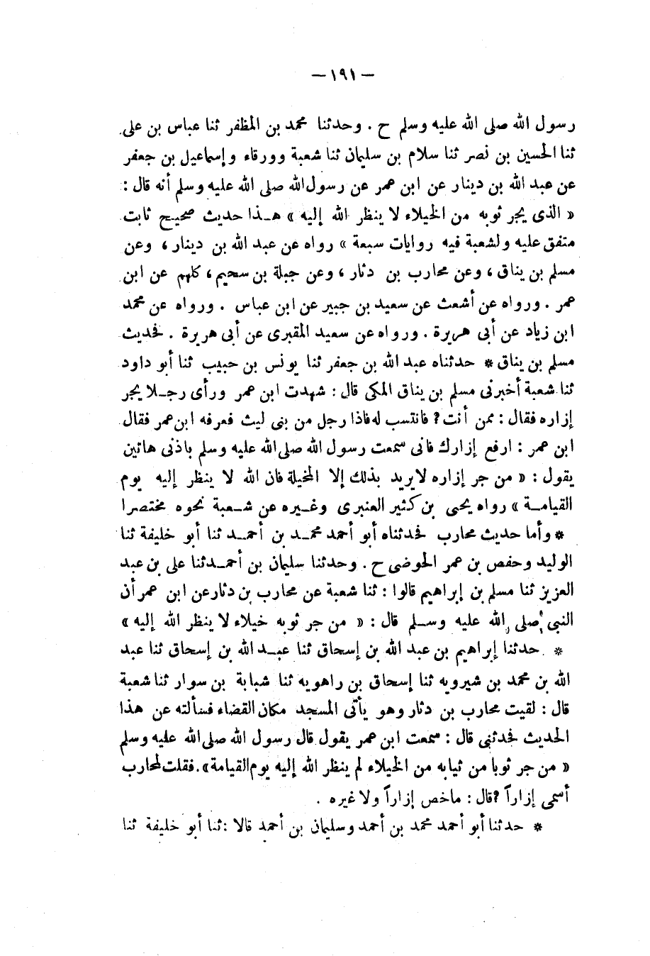 وَأَمَّا حَدِيثُ مُحَارِبٍ فَحَدَّثْنَاهُ أَبُو أَحْمَدَ مُحَمَّدُ بْنُ أَحْمَدَ , ثنا أَبُو خَلِيفَةَ، ثنا الْوَلِيدُ، وَحَفْصُ بْنُ عُمَرَ الْحَوْضِيُّ، ح وَحَدَّثَنَا سُلَيْمَانُ بْنُ أَحْمَدَ، ثنا عَلِيُّ بْنُ عَبْدِ الْعَزِيزِ، ثنا مُسْلِمُ بْنُ إِبْرَاهِيمَ، قَالُوا: ثنا شُعْبَةُ، عَنْ مُحَارِبِ بْنِ دِثَارٍ، عَنِ ابْنِ عُمَرَ، أَنَّ النَّبِيَّ صَلَّى اللهُ عَلَيْهِ وَسَلَّمَ قَالَ: «§مَنْ جَرَّ ثَوْبَهُ خُيَلَاءَ لَا يَنْظُرُ اللهُ إِلَيْهِ»