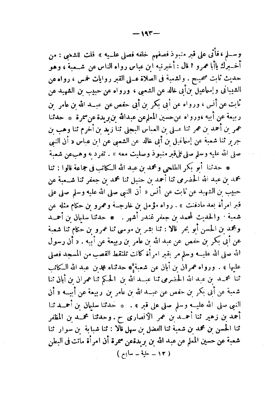 حَدَّثَنَا أَبُو بَكْرٍ الطَّلْحِيُّ، وَمُحَمَّدُ بْنُ عَبْدِ اللهِ الْكَاتِبُ، فِي جَمَاعَةٍ قَالُوا: ثنا مُحَمَّدُ بْنُ عَبْدِ اللهِ الْحَضْرَمِيُّ، ثنا أَحْمَدُ بْنُ حَنْبَلٍ، ثنا مُحَمَّدُ بْنُ جَعْفَرٍ، ثنا شُعْبَةُ، عَنْ حَبِيبِ بْنِ الشَّهِيدِ، عَنْ ثَابِتٍ، عَنْ أَنَسٍ، «أَنَّ §النَّبِيَّ صَلَّى اللهُ عَلَيْهِ وَسَلَّمَ صَلَّى عَلَى قَبْرِ امْرَأَةٍ بَعْدَ مَا دُفِنَتْ» رَوَاهُ مُؤَمَّلُ بْنُ خَارِجَةَ , وَعَمْرُو بْنُ حَكَّامٍ مِثْلَهُ , عَنْ شُعْبَةَ. وَالْحَدِيثُ لِمُحَمَّدِ بْنِ جَعْفَرٍ غُنْدَرٍ أَشْهَرُ
