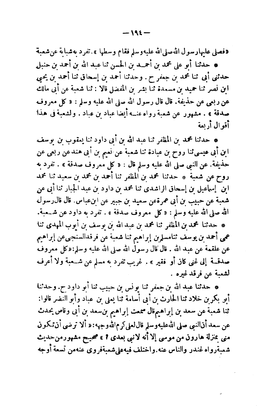 حَدَّثَنَا أَبُو عَلِيٍّ مُحَمَّدُ بْنُ أَحْمَدَ بْنِ الْحَسَنِ , ثنا عَبْدُ اللهِ بْنُ أَحْمَدَ بْنِ حَنْبَلٍ، حَدَّثَنِي أَبِي، ثنا مُحَمَّدُ بْنُ جَعْفَرٍ، ح وَحَدَّثَنَا أَحْمَدُ بْنُ إِسْحَاقَ، ثنا أَحْمَدُ بْنُ يَحْيَى بْنِ نَصْرٍ، ثنا حُمَيْدُ بْنُ مَسْعَدَةَ، ثنا بِشْرُ بْنُ الْمُفَضَّلِ، قَالَا: ثنا شُعْبَةُ، عَنْ أَبِي مَالِكٍ، عَنْ رِبْعِيٍّ، عَنْ حُذَيْفَةَ، قَالَ: قَالَ رَسُولُ اللهِ صَلَّى اللهُ عَلَيْهِ وَسَلَّمَ: «§كُلُّ مَعْرُوفٍ صَدَقَةٌ» مَشْهُورٌ عَنْ شُعْبَةَ، رَوَاهُ عَنْهُ أَيْضًا عَبَّادُ بْنُ عَبَّادٍ، وَلِشُعْبَةَ فِي هَذَا أَقْوَالٌ أَرْبَعَةٌ