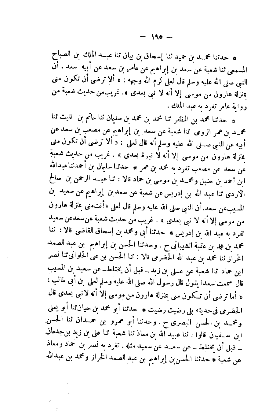 حَدَّثَنَا مُحَمَّدُ بْنُ حُمَيْدٍ، ثنا إِسْحَاقُ بْنُ بَيَانٍ، ثنا عَبْدُ الْمَلِكِ بْنُ الصَّبَّاحِ الْمِسْمَعِيُّ، ثنا شُعْبَةُ، عَنْ سَعْدِ بْنِ إِبْرَاهِيمَ، عَنْ عَامِرِ بْنِ سَعْدٍ، عَنْ أَبِيهِ سَعْدٍ، " أَنَّ النَّبِيَّ صَلَّى اللهُ عَلَيْهِ وَسَلَّمَ قَالَ لِعَلِيٍّ كَرَّمَ اللهُ وَجْهَهُ: «§أَلَا تَرْضَى أَنْ تَكُونَ مِنِّي بِمَنْزِلَةِ هَارُونَ مِنْ مُوسَى؟ إِلَّا أَنَّهُ لَا نَبِيَّ بَعْدِي» غَرِيبٌ مِنْ حَدِيثِ شُعْبَةَ مِنْ رِوَايَةِ عَامِرٍ , تَفَرَّدَ بِهِ عَبْدُ الْمَلِكِ