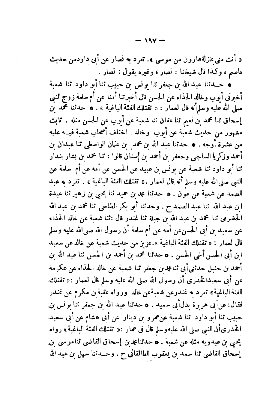حَدَّثَنَا مُحَمَّدُ بْنُ أَحْمَدَ بْنِ الْحَسَنِ، ثنا عَبْدُ اللهِ بْنُ أَحْمَدَ بْنِ حَنْبَلٍ، حَدَّثَنِي أَبِي، ثنا مُحَمَّدُ بْنُ جَعْفَرٍ، ثنا شُعْبَةُ، عَنْ خَالِدٍ الْحَذَّاءِ، عَنْ عِكْرِمَةَ، عَنْ أَبِي سَعِيدٍ الْخُدْرِيِّ، أَنَّ رَسُولَ اللهِ صَلَّى اللهُ عَلَيْهِ وَسَلَّمَ قَالَ لِعَمَّارٍ: «§تَقْتُلُكَ الْفِئَةُ الْبَاغِيَةُ» تَفَرَّدَ بِهِ غُنْدَرٌ , عَنْ شُعْبَةَ، عَنْ خَالِدٍ، وَرَوَاهُ عُقْبَةُ بْنُ مُكْرَمٍ , عَنْ غُنْدَرٍ، فَقَالَ: عَنْ أَبِي هُرَيْرَةَ، بَدَلَ أَبِي سَعِيدٍ