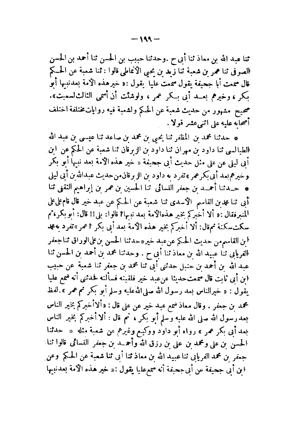 حَدَّثَنَا الْحَسَنُ بْنُ عَلِيٍّ الْوَرَّاقُ، ثنا جَعْفَرٌ الْفِرْيَابِيُّ، ثنا عُبَيْدُ اللهِ بْنُ مُعَاذٍ، ثنا أَبِي، ح وَحَدَّثَنَا مُحَمَّدُ بْنُ أَحْمَدَ بْنِ الْحَسَنِ، ثنا عَبْدُ اللهِ بْنُ أَحْمَدَ بْنِ حَنْبَلٍ، حَدَّثَنِي أَبِي، ثنا مُحَمَّدُ بْنُ جَعْفَرٍ، ثنا شُعْبَةُ، عَنْ حَبِيبِ بْنِ أَبِي ثَابِتٍ، قَالَ: سَمِعْتُ حَدِيثًا عَنْ عَبْدِ خَيْرٍ، فَلَقِيتُهُ فَسَأَلْتُهُ , فَحَدَّثَنِي أَنَّهُ سَمِعَ عَلِيًّا، يَقُولُ: «§خَيْرُ النَّاسِ بَعْدَ رَسُولِ اللهِ صَلَّى اللهُ عَلَيْهِ وَسَلَّمَ أَبُو بَكْرٍ , ثُمَّ عُمَرُ» لَفْظُ مُحَمَّدِ بْنِ جَعْفَرٍ