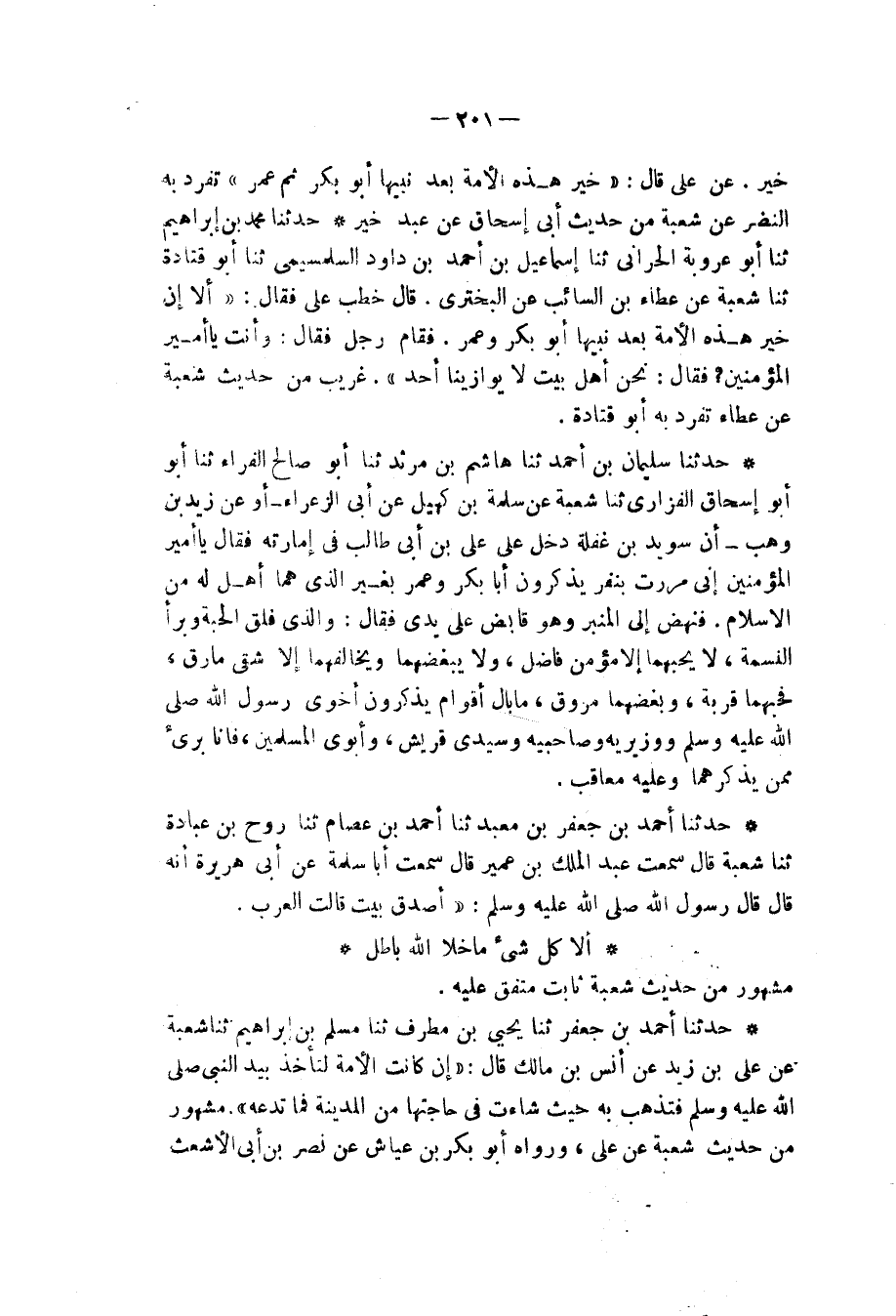 حَدَّثَنَا مُحَمَّدُ بْنُ إِبْرَاهِيمَ، ثنا أَبُو عَرُوبَةَ الْحَرَّانِيُّ، ثنا إِسْمَاعِيلُ بْنُ أَحْمَدَ بْنِ دَاوُدَ السَّلِيمِيُّ، ثنا أَبُو قَتَادَةَ، ثنا شُعْبَةُ، عَنْ عَطَاءِ بْنِ السَّائِبِ، عَنِ أَبِي الْبَخْتَرِيِّ، قَالَ: " خَطَبَ عَلِيٌّ، فَقَالَ: " أَلَا إِنَّ §خَيْرَ هَذِهِ الْأُمَّةِ بَعْدَ نَبِيِّهَا أَبُو بَكْرٍ , وَعُمَرُ , فَقَامَ رَجُلٌ فَقَالَ: وَأَنْتَ يَا أَمِيرَ الْمُؤْمِنِينَ , فَقَالَ: نَحْنُ أَهْلُ بَيْتٍ لَا يُوَازِينَا أَحَدٌ " غَرِيبٌ مِنْ حَدِيثِ شُعْبَةَ , عَنْ عَطَاءٍ، تَفَرَّدَ بِهِ أَبُو قَتَادَةَ
