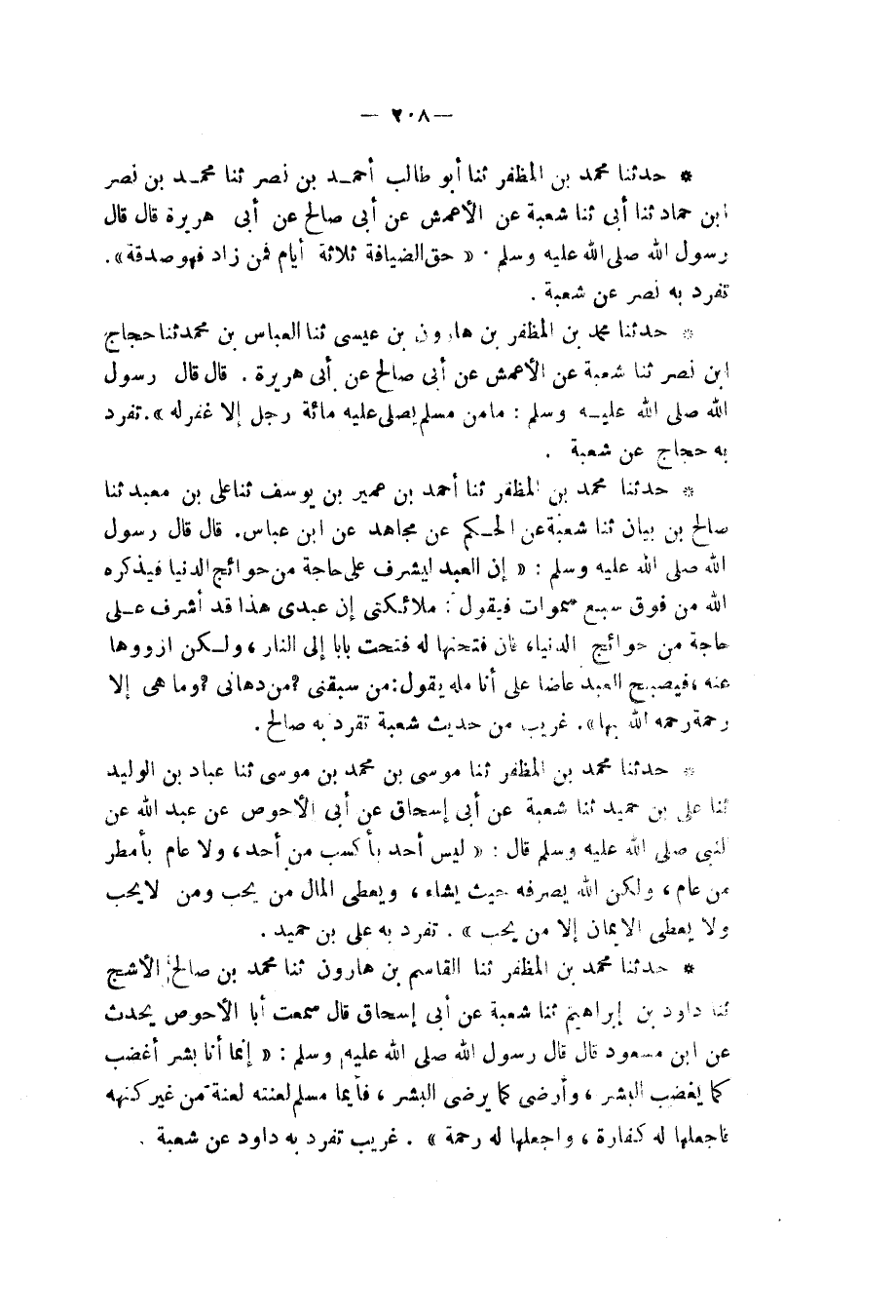 حَدَّثَنَا مُحَمَّدُ بْنُ الْمُظَفَّرِ، ثنا أَبُو طَالِبٍ أَحْمَدُ بْنُ نَصْرٍ , ثنا مُحَمَّدُ بْنُ نَصْرِ بْنِ حَمَّادٍ، ثنا أَبِي، ثنا شُعْبَةُ، عَنِ الْأَعْمَشِ، عَنْ أَبِي صَالِحٍ، عَنْ أَبِي هُرَيْرَةَ، قَالَ: قَالَ رَسُولُ اللهِ صَلَّى اللهُ عَلَيْهِ وَسَلَّمَ: «§حَقُّ الضِّيَافَةِ ثَلَاثَةُ أَيَّامٍ , فَمَنْ زَادَ فَهُوَ صَدَقَةٌ» تَفَرَّدَ بِهِ نَصْرٌ , عَنْ شُعْبَةَ