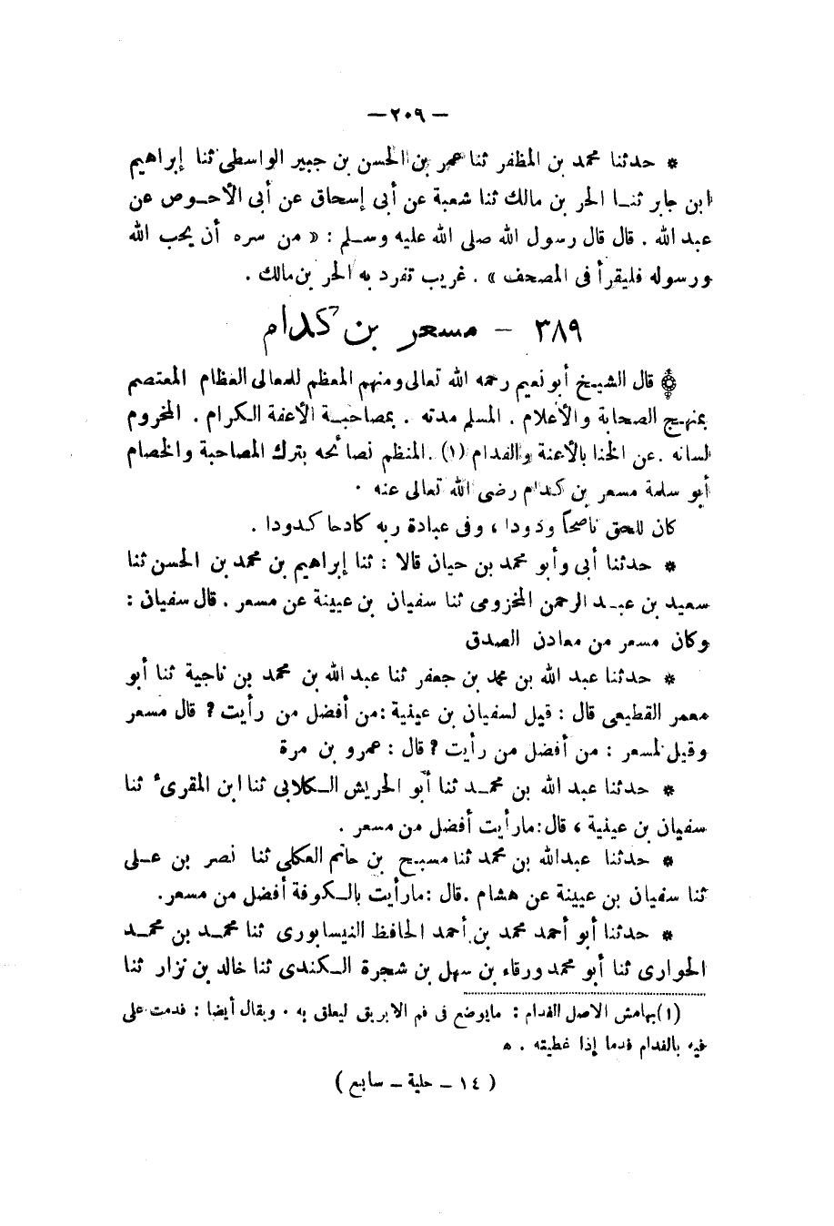 §مِسْعَرُ بْنُ كِدَامٍ قَالَ الشَّيْخُ أَبُو نُعَيْمٍ رَحِمَهُ اللهُ تَعَالَى: وَمِنْهُمُ الْمُعَظِّمُ لِلْمَعَالِي الْعِظَامْ , الْمُعْتَصِمُ بِمَنْهَجِ الصَّحَابَةِ وَالْأَعْلَامْ , الْمُسَلَّمُ مُدَّتَهُ بِمُصَاحَبَةِ الْأَعِفَّةِ الْكِرَامْ , الْمَخْرُومُ لِسَانُهُ عَنِ الْخَنَا بِالْأَعِنَّةِ، وَالْفَدَامْ , الْمُنَظِّمُ نَصَائِحَهُ بِتَرْكِ الْمُصَاحَبَةِ وَالْخِصَامْ , أَبُو سَلَمَةَ مِسْعَرُ بْنُ كِدَامْ , رَضِيَ اللهُ تَعَالَى عَنْهُ , كَانَ لِلْحَقِّ نَاصِحًا وَدُودَا , وَفِي عِبَادَةِ رَبِّهِ كَادِحًا كَدُودَا