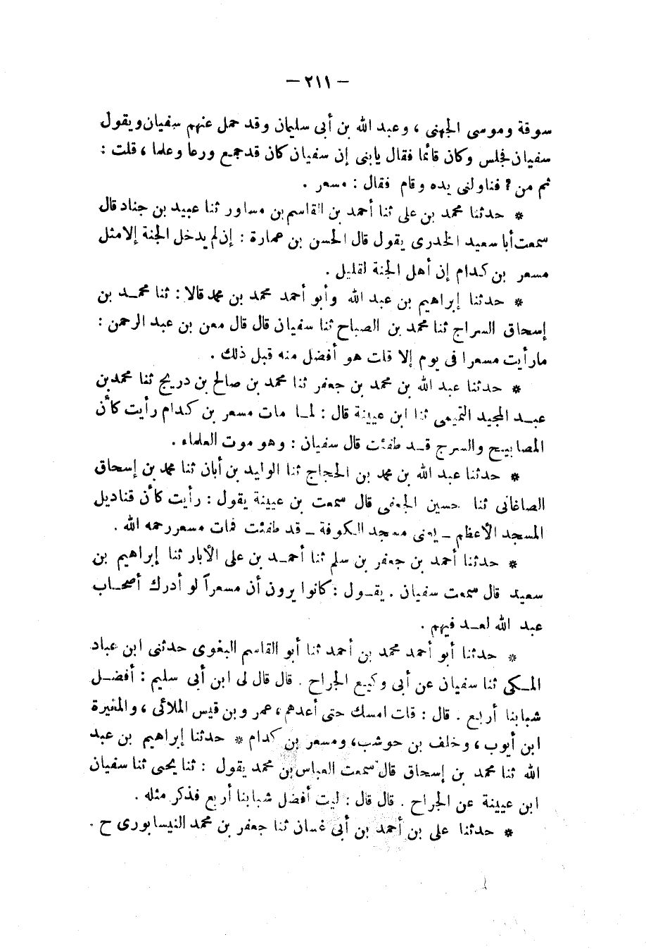 حَدَّثَنَا مُحَمَّدُ بْنُ عَلِيٍّ، ثنا أَحْمَدُ بْنُ الْقَاسِمِ بْنِ مُسَاوِرٍ، ثنا عُبَيْدُ بْنُ جُنَادٍ، قَالَ: سَمِعْتُ أَبَا سَعِيدٍ الْخُدْرِيَّ، يَقُولُ: قَالَ الْحَسَنُ بْنُ عُمَارَةَ: «§إِنْ لَمْ يَدْخُلِ الْجَنَّةَ إِلَّا مِثْلُ مِسْعَرِ بْنِ كِدَامٍ إِنَّ أَهْلَ الْجَنَّةِ لَقَلِيلٌ»