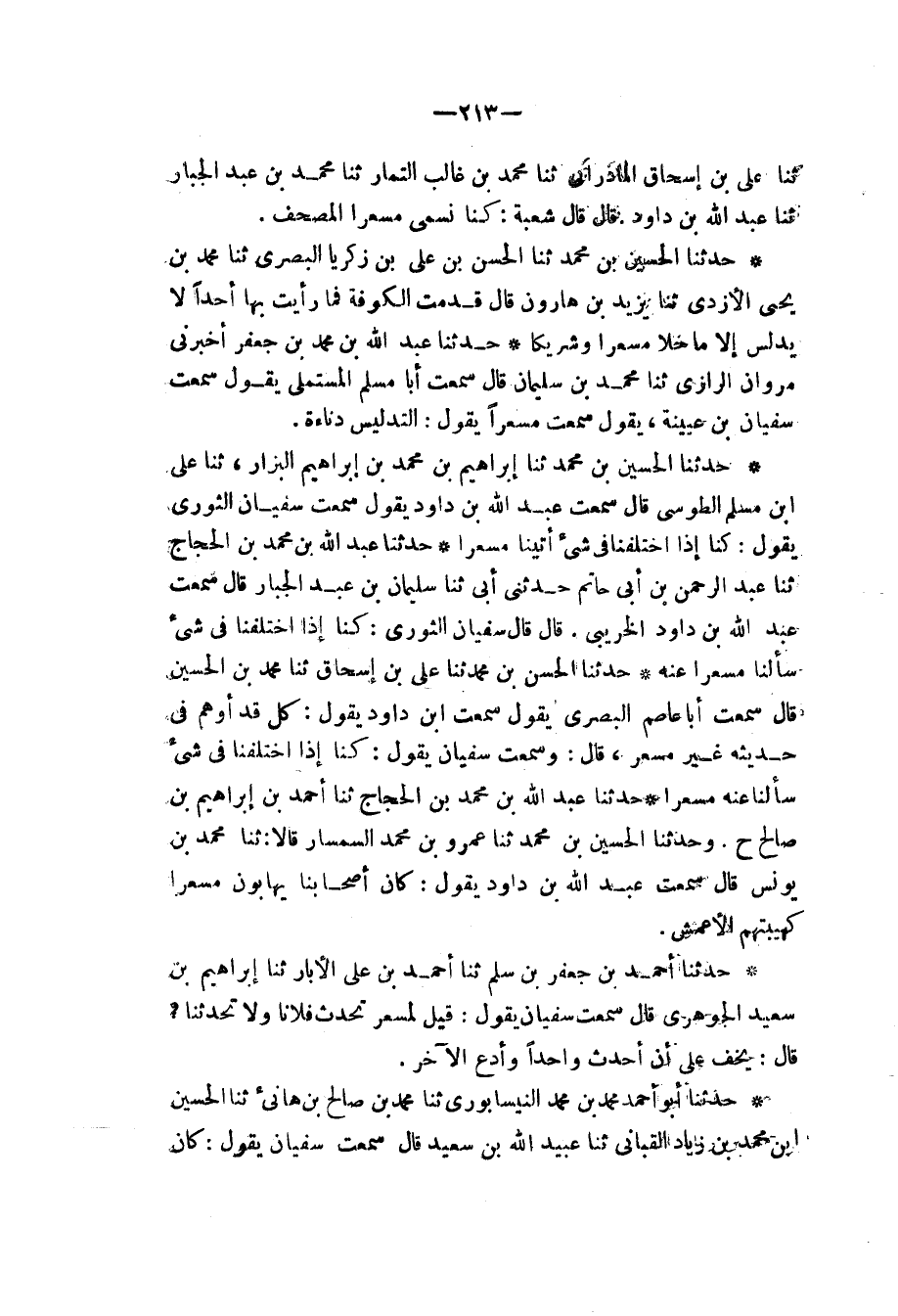 حَدَّثَنَا عَبْدُ اللهِ بْنُ مُحَمَّدِ بْنِ الْحَجَّاجِ، ثنا عَبْدُ الرَّحْمَنِ بْنُ أَبِي حَاتِمٍ، حَدَّثَنِي أَبِي، ثنا سُلَيْمَانُ بْنُ عَبْدِ الْجَبَّارِ، قَالَ: سَمِعْتُ عَبْدَ اللهِ بْنَ دَاوُدَ الْخُرَيْبِيَّ، قَالَ: قَالَ سُفْيَانُ الثَّوْرِيُّ: «كُنَّا §إِذَا اخْتَلَفْنَا فِي شَيْءٍ سَأَلْنَا مِسْعَرًا عَنْهُ»