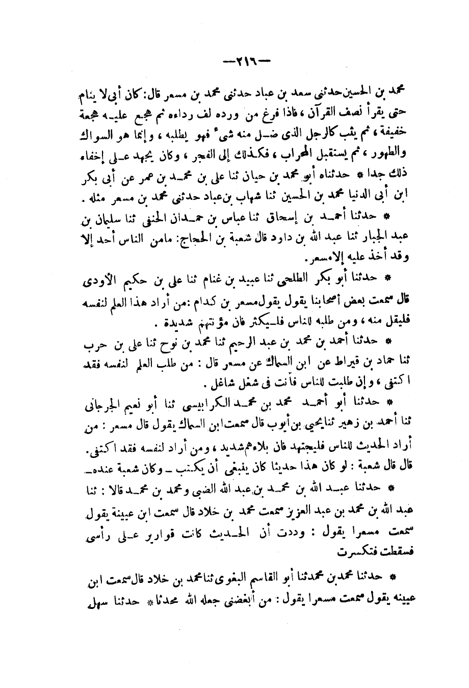 حَدَّثَنَا عَبْدُ اللهِ بْنُ مُحَمَّدِ بْنِ عَبْدِ اللهِ الضَّبِّيُّ، وَمُحَمَّدُ بْنُ مُحَمَّدٍ، قَالَا: ثنا عَبْدُ اللهِ بْنُ مُحَمَّدِ بْنِ عَبْدِ الْعَزِيزِ، سَمِعْتُ مُحَمَّدَ بْنَ خَلَّادٍ، قَالَ: سَمِعْتُ ابْنَ عُيَيْنَةَ، يَقُولُ: سَمِعْتُ مِسْعَرًا، يَقُولُ: «§وَدِدْتُ أَنَّ الْحَدِيثَ، كَانَتْ قَوَارِيرَ عَلَى رَأْسِي فَسَقَطَتْ فَتَكَسَّرَتْ»