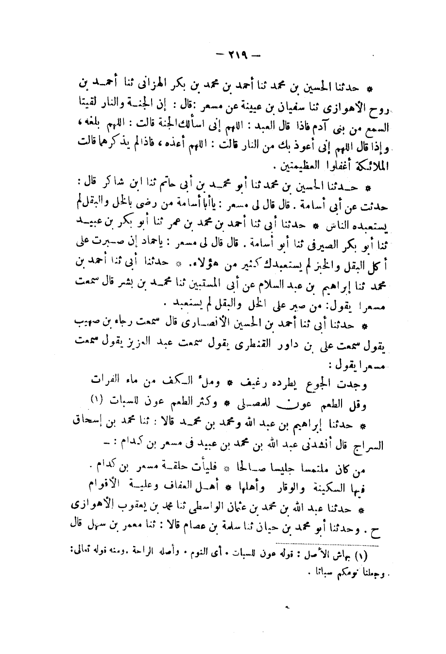 حَدَّثَنَا الْحُسَيْنُ بْنُ مُحَمَّدٍ، ثنا أَحْمَدُ بْنُ مُحَمَّدِ بْنِ بَكْرٍ الْهِزَّانِيُّ، ثنا أَحْمَدُ بْنُ رَوْحٍ الْأَهْوَازِيُّ، ثنا سُفْيَانُ بْنُ عُيَيْنَةَ، عَنْ مِسْعَرٍ، قَالَ: " إِنَّ §الْجَنَّةَ وَالنَّارَ لَقِيَتَا السَّمْعَ مِنْ بَنِي آدَمَ , فَإِذَا قَالَ الْعَبْدُ: اللهُمَّ إِنِّي أَسْأَلُكُ الْجَنَّةَ قَالَتِ: اللهُمَّ بَلِّغْهُ , وَإِذَا قَالَ: اللهُمَّ إِنِّي أَعُوذُ بِكَ مِنَ النَّارِ قَالَتِ: اللهُمَّ أَعِذْهُ , فَإِذَا لَمْ يَذْكُرْهُمَا قَالَتِ الْمَلَائِكَةُ: أَغْفَلُوا الْعَظِيمَتَيْنِ "