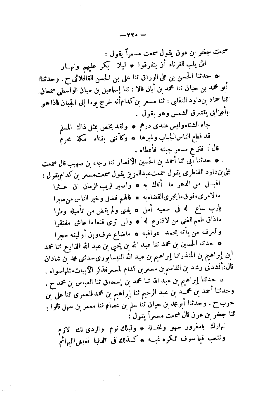 حَدَّثَنَا الْحُسَيْنُ بْنُ مُحَمَّدٍ، ثنا عَبْدُ اللهِ بْنُ يَحْيَى بْنِ عَبْدِ اللهِ الذَّارَّعُ، ثنا مُحَمَّدُ بْنُ إِبْرَاهِيمَ بْنِ الْمُنْذِرِ، ثنا إِبْرَاهِيمُ بْنُ عَبْدِ اللهِ النَّيْسَابُورِيُّ، حَدَّثَنِي مُحَمَّدُ بْنُ شَاذَانَ، قَالَ: أَنْشَدَنِي الْقَاسِمُ بْنُ رِشْدِينَ، عَنْ مِسْعَرِ بْنِ كِدَامٍ، لِمِسْعَرٍ , فَذَكَرَ الْأَبْيَاتَ مِثْلَهَا سَوَاءً