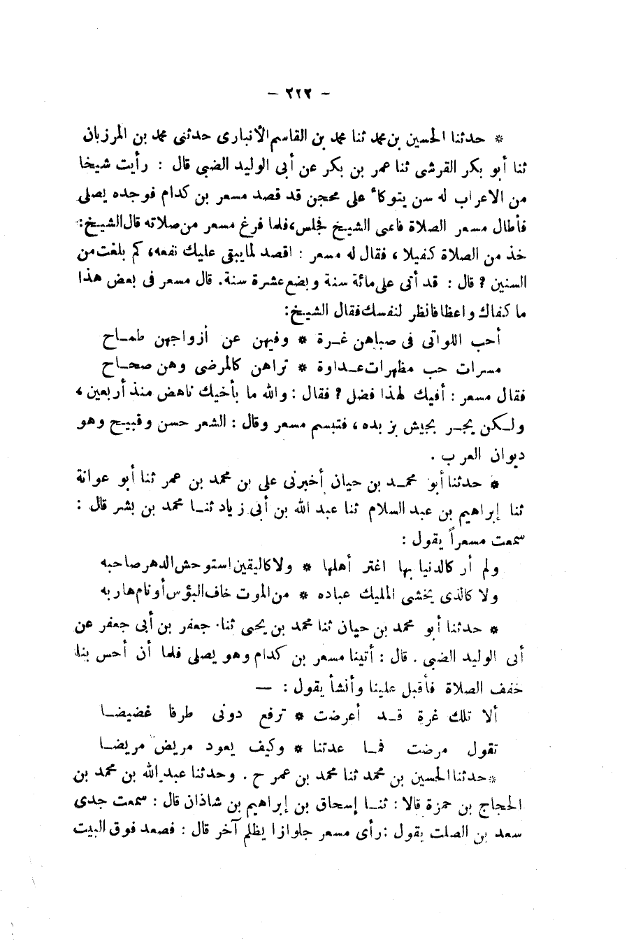 حَدَّثَنَا الْحُسَيْنُ بْنُ مُحَمَّدٍ، ثنا مُحَمَّدُ بْنُ الْقَاسِمِ الْأَنْبَارِيُّ، حَدَّثَنِي مُحَمَّدُ بْنُ الْمَرْزُبَانِ، ثنا أَبُو بَكْرٍ الْقُرَشِيُّ، ثنا عُمَرُ بْنُ بَكْرٍ، عَنْ أَبِي الْوَلِيدِ الضَّبِّيِّ، قَالَ: " رَأَيْتُ شَيْخًا مِنَ الْأَعْرَابِ لَهُ سِنٌّ يَتَوَكَّأُ عَلَى مِحْجَنٍ قَدْ قَصَدَ مِسْعَرَ بْنَ كِدَامٍ , فَوَجَدَهُ يُصَلِّي , فَأَطَالَ مِسْعَرٌ الصَّلَاةَ , فَأَعَيَا الشَّيْخُ فَجَلَسَ , فَلَمَّا فَرَغَ مِسْعَرٌ مِنْ صَلَاتِهِ قَالَ الشَّيْخُ: خُذْ مِنَ الصَّلَاةِ كَفِيلًا فَقَالَ لَهُ مِسْعَرٌ: اقْصِدْ لِمَا يَبْقَى عَلَيْكَ نَفْعُهُ , كَمْ بَلَغَتْ مِنَ السِّنِينَ؟ قَالَ: قَدْ أَتَى عَلَيَّ مِائَةُ سَنَةٍ وَبِضْعَ عَشْرَةَ سَنَةً قَالَ مِسْعَرٌ: فِي بَعْضِ هَذَا مَا كَفَاكَ وَاعِظًا , فَانْظُرْ لِنَفْسِكَ , فَقَالَ الشَّيْخُ: