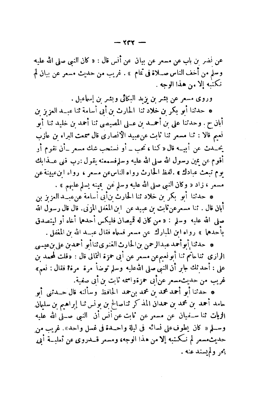 حَدَّثَنَا أَبُو أَحْمَدَ مُحَمَّدُ بْنُ مُحَمَّدِ بْنِ أَحْمَدَ الْحَافِظُ، - وَسَأَلْتُهُ - قَالَ: حَدَّثَنِي أَبُو حَامِدٍ أَحْمَدُ بْنُ مُحَمَّدِ بْنِ حَمْدَانَ الْمُذَكِّرُ , ثنا صَالِحُ بْنُ يُونُسَ، ثنا إِبْرَاهِيمُ بْنُ سُلَيْمَانَ الزَّيَّاتُ، ثنا سُفْيَانُ، عَنْ مِسْعَرٍ، عَنْ ثَابِتٍ، عَنْ أَنَسٍ، «أَنَّ §النَّبِيَّ صَلَّى اللهُ عَلَيْهِ وَسَلَّمَ كَانَ يَطُوفُ عَلَى نِسَائِهِ فِي لَيْلَةٍ وَاحِدَةٍ فِي غُسْلٍ وَاحِدٍ» غَرِيبٌ مِنْ حَدِيثِ مِسْعَرٍ , لَمْ نَكْتُبْهُ إِلَّا مِنْ هَذَا الْوَجْهِ , وَمِسْعَرٌ قَدْ رَوَى عَنْ ثَعْلَبَةَ أَبِي بَحْرٍ وَلَمْ يُسْنِدْ عَنْهُ