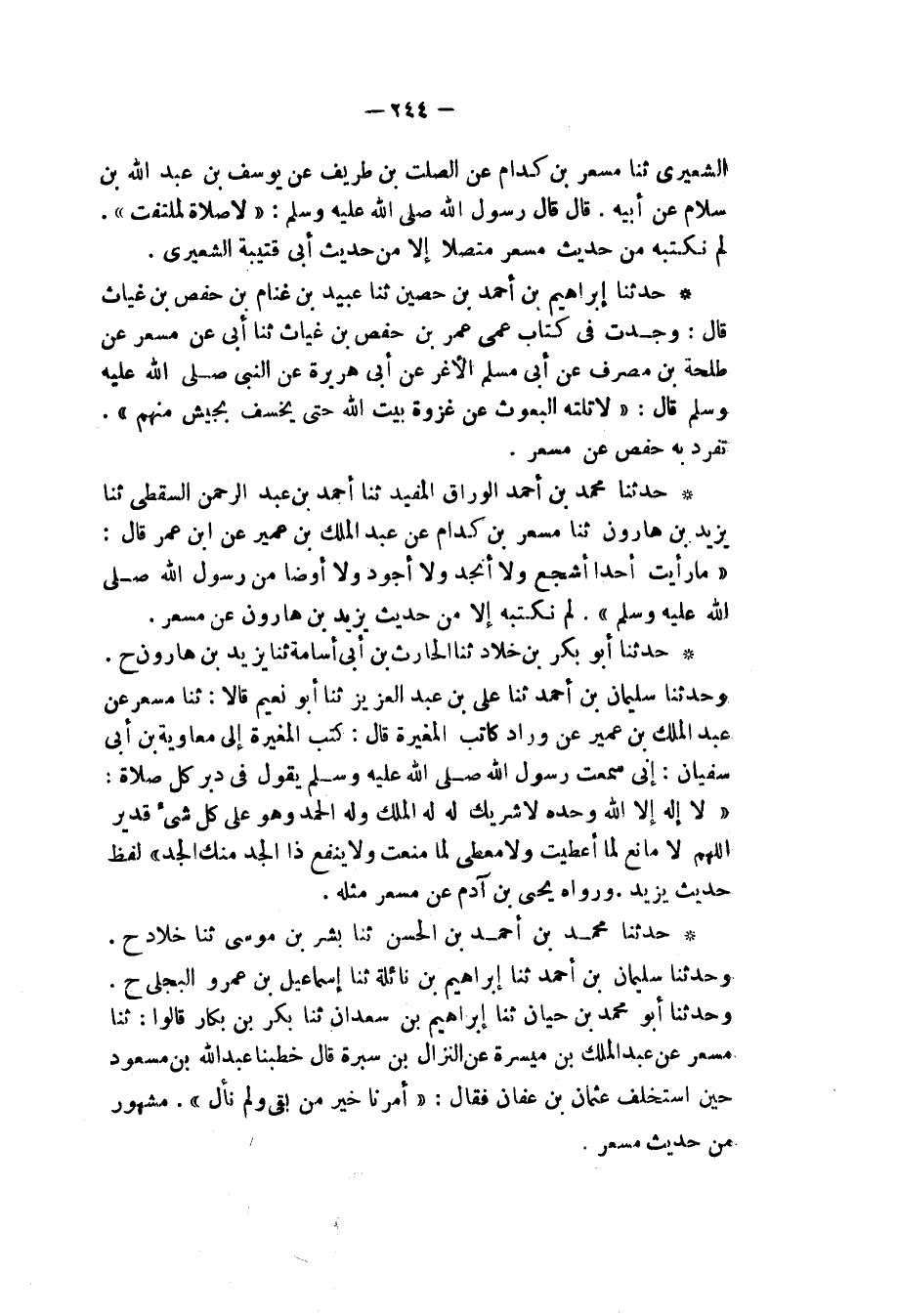 حَدَّثَنَا مُحَمَّدُ بْنُ أَحْمَدَ بْنِ الْحَسَنِ، ثنا بِشْرُ بْنُ مُوسَى، ثنا خَلَّادٌ، ح وَحَدَّثَنَا سُلَيْمَانُ بْنُ أَحْمَدَ، ثنا إِبْرَاهِيمُ بْنُ نَائِلَةَ، ثنا إِسْمَاعِيلُ بْنُ عَمْرٍو الْبَجَلِيُّ، ح وَحَدَّثَنَا أَبُو مُحَمَّدِ بْنُ حَيَّانَ، ثنا إِبْرَاهِيمُ بْنُ سَعْدَانَ، ثنا بَكْرُ بْنُ بَكَّارٍ، قَالُوا: ثنا مِسْعَرٌ، عَنْ عَبْدِ الْمَلِكِ بْنِ مَيْسَرَةَ، عَنِ النَّزَّالِ بْنِ سَبْرَةَ، قَالَ: " خَطَبَنَا عَبْدُ اللهِ بْنُ مَسْعُودٍ، حِينَ اسْتُخْلِفَ عُثْمَانُ بْنُ عَفَّانَ فَقَالَ: «§أَمَّرْنَا خَيْرَ مَنْ بَقِيَ وَلَمْ نَأْلُ» مَشْهُورٌ مِنْ حَدِيثِ مِسْعَرٍ
