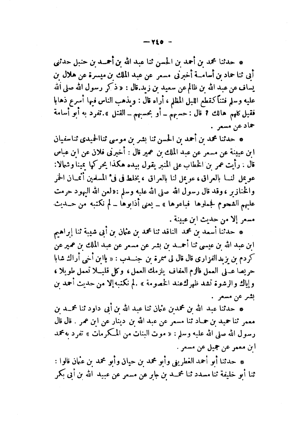 حَدَّثَنَا مُحَمَّدُ بْنُ أَحْمَدَ بْنِ الْحَسَنِ، ثنا عَبْدُ اللهِ بْنُ أَحْمَدَ بْنِ حَنْبَلٍ، حَدَّثَنِي أَبِي، ثنا حَمَّادُ بْنُ أُسَامَةَ، أَخْبَرَنِي مِسْعَرٌ، عَنْ عَبْدِ الْمَلِكِ بْنِ مَيْسَرَةَ، عَنْ هِلَالِ بْنِ يَسَافٍ، عَنْ عَبْدِ اللهِ بْنِ ظَالِمٍ، عَنْ سَعِيدِ بْنِ زَيْدٍ، قَالَ: " ذَكَرَ رَسُولُ اللهِ صَلَّى اللهُ عَلَيْهِ وَسَلَّمَ فِتَنًا كَقِطَعِ اللَّيْلِ الْمُظْلِمِ , أُرَاهُ قَالَ: «§وَيَذْهَبُ النَّاسُ فِيهَا أَسْرَعَ ذِهَابًا» , فَقِيلَ: كُلُّهُمْ هَالِكٌ؟ قَالَ: «حَسْبُهُمْ - أَوْ بِحَسْبِهِمُ - الْقَتْلُ» تَفَرَّدَ بِهِ أَبُو أُسَامَةَ حَمَّادٌ , عَنْ مِسْعَرٍ