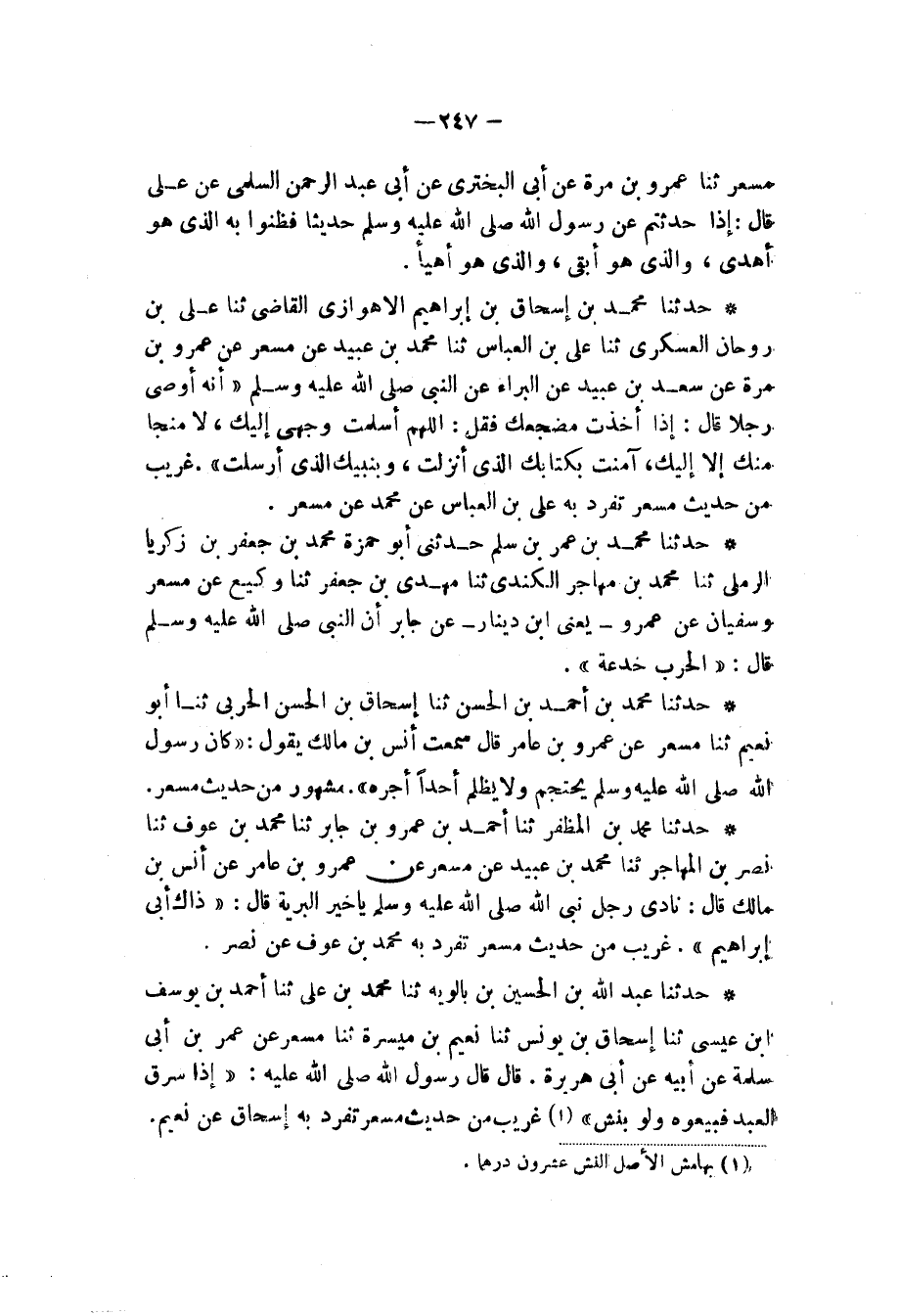 حَدَّثَنَا مُحَمَّدُ بْنُ أَحْمَدَ بْنِ الْحَسَنِ، ثنا إِسْحَاقُ بْنُ الْحَسَنِ الْحَرْبِيُّ، ثنا أَبُو نُعَيْمٍ، ثنا مِسْعَرٌ، عَنْ عَمْرِو بْنِ عَامِرٍ، قَالَ: سَمِعْتُ أَنَسَ بْنَ مَالِكٍ، يَقُولُ: «كَانَ رَسُولُ اللهِ صَلَّى اللهُ عَلَيْهِ وَسَلَّمَ §يَحْتَجِمُ، وَلَا يَظْلِمُ أَحَدًا أَجْرَهُ» مَشْهُورٌ مِنْ حَدِيثِ مِسْعَرٍ