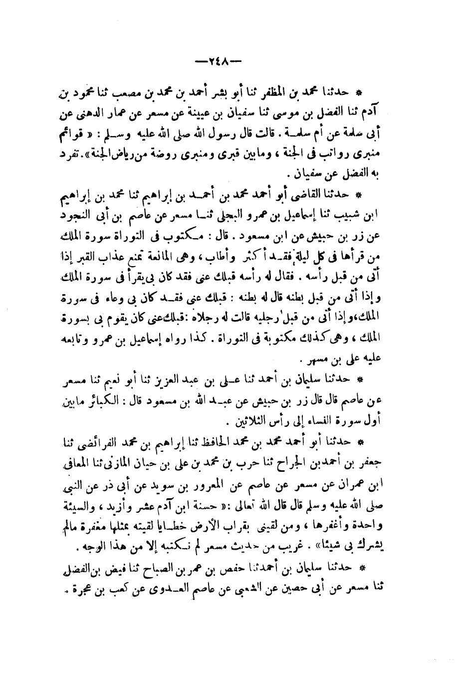 حَدَّثَنَا الْقَاضِي أَبُو أَحْمَدَ مُحَمَّدُ بْنُ أَحْمَدَ بْنِ إِبْرَاهِيمَ , ثنا مُحَمَّدُ بْنُ إِبْرَاهِيمَ بْنِ شَبِيبٍ، ثنا إِسْمَاعِيلُ بْنُ عَمْرٍو الْبَجَلِيُّ، ثنا مِسْعَرٌ، عَنْ عَاصِمِ بْنِ أَبِي النَّجُودِ، عَنْ زِرِّ بْنِ حُبَيْشٍ، عَنِ ابْنِ مَسْعُودٍ، قَالَ: " §مَكْتُوبٌ فِي التَّوْرَاةِ: سُورَةُ الْمُلْكِ مَنْ قَرَأَهَا فِي كُلِّ لَيْلَةٍ فَقَدْ أَكْثَرَ، وَأَطَابَ , وَهِيَ الْمَانِعَةُ , تَمْنَعُ عَذَابَ الْقَبْرِ , إِذَا أُتِيَ مِنْ قِبَلِ رَأْسِهِ فَقَالَ لَهُ رَأْسُهُ: قِبَلَكَ عَنِّي , فَقَدْ كَانَ بِي يَقْرَأُ فِي سُورَةِ الْمُلْكِ , وَإِذَا أُتِيَ مِنْ قِبَلِ بَطْنِهِ قَالَ لَهُ بَطْنُهُ: قِبَلَكَ عَنِّي , فَقَدْ كَانَ بِي وِعَاءٌ فِي سُورَةِ الْمُلْكِ , وَإِذَا أُتِيَ مِنْ قِبَلِ رِجْلَيْهِ قَالَتْ لَهُ رِجْلَاهُ: قِبَلَكَ عَنِّي , كَانَ يَقُومُ بِي بِسُورَةِ الْمُلْكِ , وَهِيَ كَذَلِكَ مَكْتُوبَةٌ فِي التَّوْرَاةِ " كَذَا رَوَاهُ إِسْمَاعِيلُ بْنُ عَمْرٍو , وَتَابَعَهُ عَلَيْهِ عَلِيُّ بْنُ مُسْهِرٍ