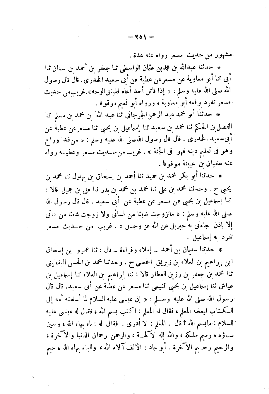 حَدَّثَنَا سُلَيْمَانُ بْنُ أَحْمَدَ، - إِمْلَاءً وَقِرَاءَةً - قَالَ: ثنا عَمْرُو بْنُ إِسْحَاقَ بْنِ إِبْرَاهِيمَ بْنِ الْعَلَاءِ بْنِ زِبْرِيقٍ الْحِمْصِيُّ، ح وَحَدَّثَنَا مُحَمَّدُ بْنُ الْحَسَنِ الْيَقْطِينِيُّ، ثنا مُحَمَّدُ بْنُ جَعْفَرِ بْنِ رَزِينٍ الْعَطَّارُ، قَالَا: ثنا إِبْرَاهِيمُ بْنُ الْعَلَاءِ، ثنا إِسْمَاعِيلُ بْنُ عَيَّاشٍ، ثنا إِسْمَاعِيلُ بْنُ يَحْيَى التَّيْمِيُّ، ثنا مِسْعَرٌ، عَنْ عَطِيَّةَ، عَنْ أَبِي سَعِيدٍ، قَالَ: قَالَ رَسُولُ اللهِ صَلَّى اللهُ عَلَيْهِ وَسَلَّمَ: " إِنَّ §عِيسَى عَلَيْهِ السَّلَامُ لَمَّا أَسْلَمَتْهُ أُمُّهُ إِلَى الْكُتَّابِ لِيُعَلِّمَهُ الْمُعَلِّمُ , فَقَالَ لَهُ الْمُعَلِّمُ: اكْتُبْ بِسْمِ اللهِ , فَقَالَ لَهُ عِيسَى عَلَيْهِ السَّلَامُ: مَا بِسْمِ اللهِ؟ قَالَ الْمُعَلِّمُ: لَا أَدْرِي , فَقَالَ لَهُ: بَاءٌ: بَهَاءُ اللهِ , وَسِينٌ: سَنَاؤُهُ , وَمِيمٌ: مُلْكُهُ , وَاللهُ إِلَهُ الْآلِهَةِ , وَالرَّحْمَنُ رَحْمَانُ الدُّنْيَا وَالْآخِرَةِ , وَالرَّحِيمُ رَحِيمُ الْآخِرَةِ , أَبْجَدُ: الْأَلْفُ: آلَاءُ اللهِ , وَالْبَاءُ بَهَاءُ اللهِ , جِيمٌ -[252]- جَمَالُ اللهِ , دَالٌ: اللهُ الدَّائِمُ , هَوَّزَ: الْهَاءُ الْهَاوِيَةُ , وَالْوَاوُ: وَيْلٌ لِأَهْلِ النَّارِ , وَالزَّايُ وَادٍ فِي جَهَنَّمَ , حُطِّي: الْحَاءُ: اللهُ الْحَلِيمُ. وَالطَّاءُ: اللهُ الطَّالِبُ لِكُلِّ حَقٍّ حَتَّى يُؤَدِّيَهُ , وَالْيَاءُ: أَيْ أَهْلُ النَّارِ وَهُوَ الْوَجَعُ , كَلَمُنْ: كَافٌ: اللهُ الْكَافِي , لَامٌ: اللهُ الْعَلِيمُ , مِيمٌ: اللهُ الْمَلِكُ , نُونٌ: الْبَحْرُ. سَعْفَصْ: سِينٌ: اللهُ الصَّادِقُ , وَالْعَيْنُ: اللهُ الْعَالِمُ , وَالْفَاءُ: اللهُ الْفَرْدُ , وَصَادٌ: اللهُ الصَّمَدُ , قَرْشَتْ: قَافٌ: الْجَبَلُ الْمُحِيطُ بِالدُّنْيَا الَّذِي اخْضَرَّتْ مِنْهُ السَّمَوَاتُ. وَالرَّاءُ: رَأَى النَّاسُ لَهَا , وَالشِّينُ: شَيْءٌ لِلَّهِ , وَالتَّاءُ: تَمَّتْ أَبَدًا " غَرِيبٌ مِنْ حَدِيثِ مِسْعَرٍ تَفَرَّدَ بِهِ إِسْمَاعِيلُ بْنُ عَيَّاشٍ , عَنْ إِسْمَاعِيلَ بْنِ يَحْيَى