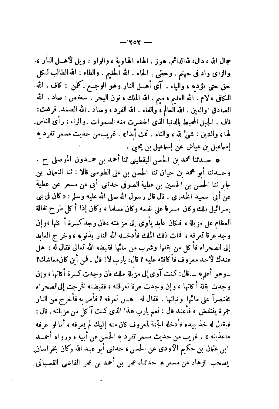 حَدَّثَنَا مُحَمَّدُ بْنُ الْحَسَنِ الْيَقْطِينِيُّ، ثنا أَحْمَدُ بْنُ حَمْدُونٍ الْمَوْصِلِيُّ، ح وَحَدَّثَنَا أَبُو مُحَمَّدِ بْنُ حَيَّانَ، ثنا الْحَسَنُ بْنُ عَلِيٍّ الطُّوسِيُّ، قَالَا: ثنا النُّعْمَانُ بْنُ جَابِرٍ، ثنا الْحُسَيْنُ بْنُ الْحَسَنِ بْنِ عَطِيَّةَ العَوْفِيُّ، حَدَّثَنِي أَبِي، عَنْ مِسْعَرٍ، عَنْ عَطِيَّةَ، عَنْ أَبِي سَعِيدٍ الْخُدْرِيِّ، قَالَ: قَالَ رَسُولُ اللهِ صَلَّى اللهُ عَلَيْهِ وَسَلَّمَ: " §كَانَ فِي بَنِي إِسْرَائِيلَ مَلِكٌ , وَكَانَ مُسْرِفًا عَلَى نَفْسِهِ , وَكَانَ مُسْلِمًا , وَكَانَ إِذَا أَكَلَ طَرَحَ تُفَالَةَ الْعِظَامِ عَلَى مَزْبَلَةٍ , فَكَانَ عَابِدٌ يَأْوِي إِلَى مَزْبَلَتِهِ , فَإِنْ وَجَدَ كِسْرَةً أَكَلَهَا , وَإِنْ وَجَدَ عَرْقًا تَعَرَّقَهُ , فَمَاتَ ذَلِكَ الْمَلِكُ , فَأَدْخَلَهُ اللهُ النَّارَ بِذُنُوبِهِ , وَخَرَجَ الْعَابِدُ إِلَى الصَّحْرَاءِ فَأَكَلَ مِنْ بَقْلِهَا , وَشَرِبَ مِنْ مَائِهَا , فَقَبَضَهُ اللهُ تَعَالَى فَقَالَ لَهُ: هَلْ عِنْدَكَ لِأَحَدٍ مَعْرُوفٌ فَأُكَافِئَهُ عَلَيْهِ؟ قَالَ: يَا رَبِّ لَا قَالَ: فَمِنْ أَيْنَ كَانَ مَعَاشُكَ؟ - وَهُوَ أَعْلَمُ بِهِ - قَالَ: كُنْتُ آوِي إِلَى مَزْبَلَةِ مَلِكٍ , فَإِنْ وَجَدْتُ كِسْرَةً أَكَلْتُهَا , وَإِنْ وَجَدْتُ بَقْلَةً أَكَلْتُهَا , وَإِنْ وَجَدْتُ عَرْقًا تَعَرَّقْتُهُ , فَقَبَضْتَهُ , فَخَرَجْتُ إِلَى الصَّحْرَاءِ مُقْتَصِرًا عَلَى مَائِهَا وَنَبَاتِهَا , فَقَالَ لَهُ: هَلْ تَعْرِفُهُ؟ فَأَمَرَ بِهِ , فَأُخْرِجَ مِنَ النَّارِ جَمْرَةً يَنْتَفِضُ , فَأُعِيدَ قَالَ: نَعَمْ يَا رَبِّ , هَذَا الَّذِي كُنْتُ آكُلُ مِنْ مَزْبَلَتِهِ , قَالَ: فَيُقَالُ لَهُ: خُذْ بِيَدِهِ فَأَدْخِلْهُ الْجَنَّةَ لِمَعْرُوفٍ كَانَ مِنْهُ إِلَيْكَ لَمْ يَعْرِفْهُ , أَمَا لَوْ عَرَفَهُ مَا عَذَّبْتُهُ " غَرِيبٌ مِنْ حَدِيثِ مِسْعَرٍ , تَفَرَّدَ بِهِ الْحُسَيْنُ عَنْ أَبِيهِ , وَرَوَاهُ أَحْمَدُ بْنُ عُثْمَانَ بْنِ حَكِيمٍ الْأَوْدِيُّ , عَنِ الْحُسَيْنِ، حَدَّثَنِي أَبُو عَبْدِ اللهِ، وَكَانَ بِخُرَاسَانَ يَصْحَبُ الزُّهَّادَ عَنْ مِسْعَرٍ حَدَّثَنَاهُ عُمَرُ بْنُ أَحْمَدَ بْنِ عُمَرَ الْقَاضِي الْقَصَبَانِيُّ -[253]-، ثنا عَلِيُّ بْنُ الْعَبَّاسِ الْبَجَلِيُّ، ثنا أَحْمَدُ بْنُ عُثْمَانَ بْنِ حَكِيمٍ، ثنا الْحُسَيْنُ بْنُ الْحَسَنِ، حَدَّثَنِي أَبُو عَبْدِ اللهِ، عَنْ مِسْعَرٍ، مِثْلَهُ