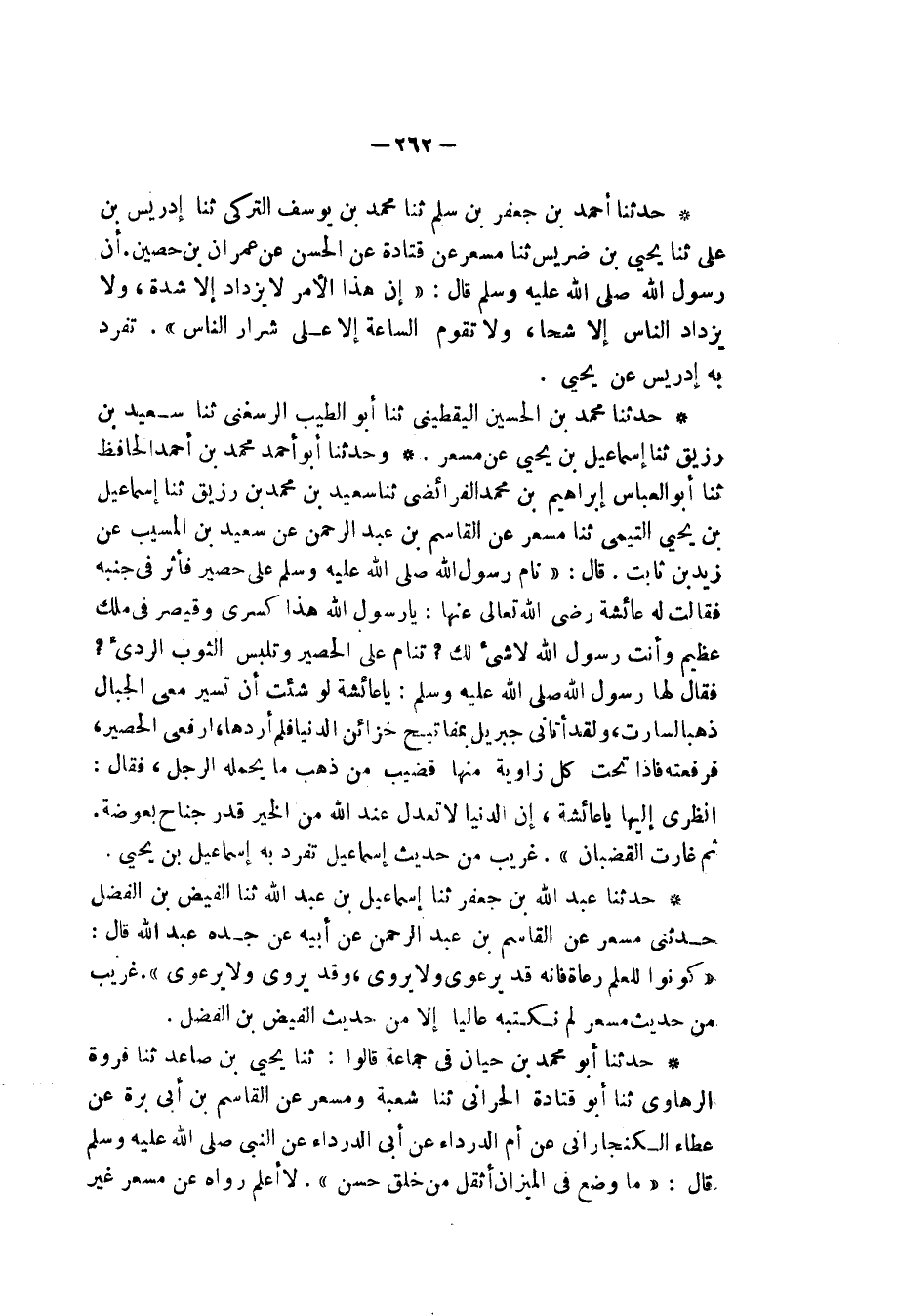 حَدَّثَنَا أَحْمَدُ بْنُ جَعْفَرِ بْنِ سَلْمٍ، ثنا مُحَمَّدُ بْنُ يُوسُفَ التُّرْكِيُّ، ثنا إِدْرِيسُ بْنُ عَلِيٍّ، ثنا يَحْيَى بْنُ ضُرَيْسٍ، ثنا مِسْعَرٌ، عَنْ قَتَادَةَ، عَنِ الْحَسَنِ، عَنْ عِمْرَانَ بْنِ حُصَيْنٍ، أَنَّ رَسُولَ اللهِ صَلَّى اللهُ عَلَيْهِ وَسَلَّمَ قَالَ: «إِنَّ §هَذَا الْأَمْرَ لَا يَزْدَادُ إِلَّا شِدَّةً , وَلَا يَزْدَادُ النَّاسُ إِلَّا شُحًّا , وَلَا تَقُومُ السَّاعَةُ إِلَّا عَلَى شِرَارِ النَّاسِ» تَفَرَّدَ بِهِ إِدْرِيسُ , عَنْ يَحْيَى
